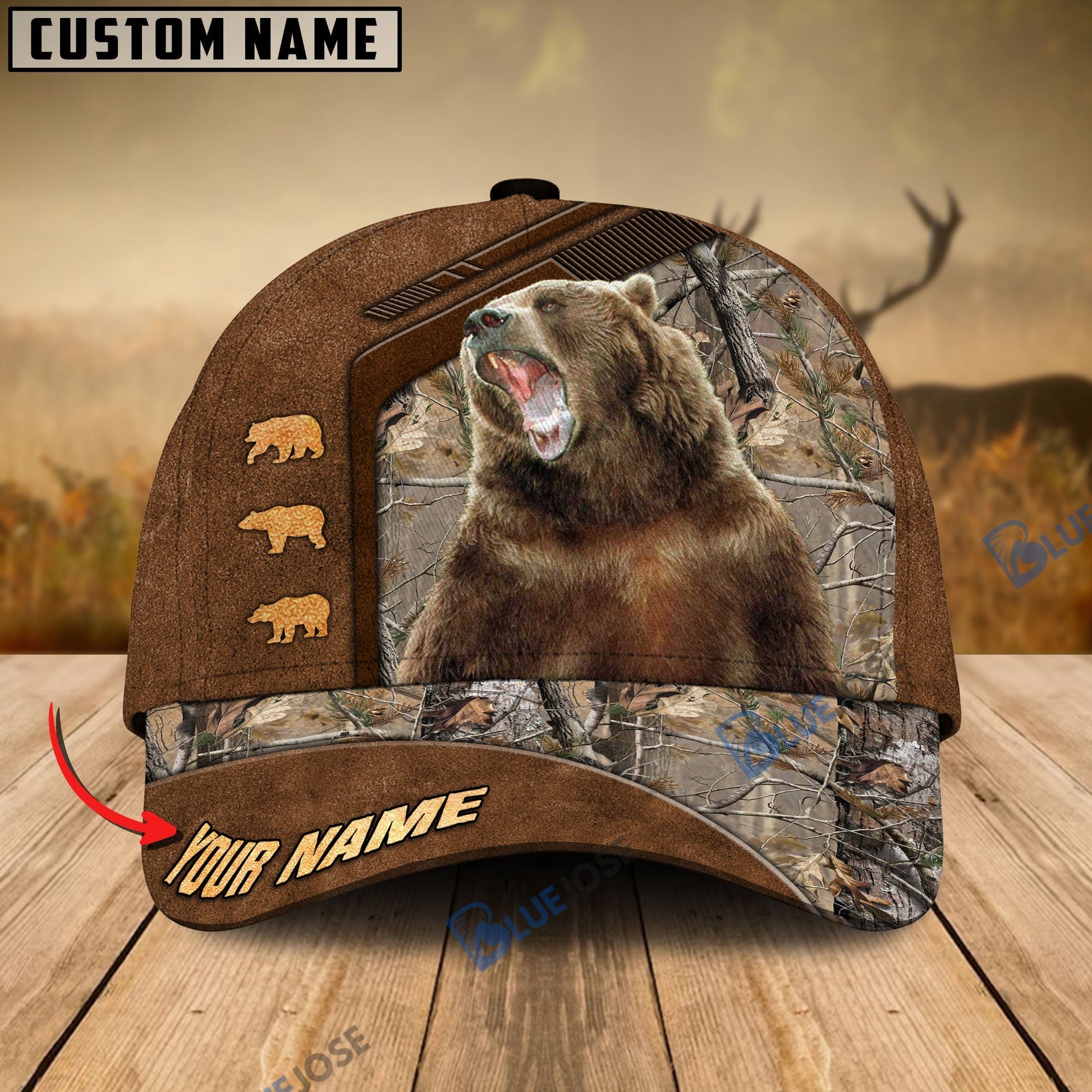 BlueJose Bear Hunting Premium Brown Pattern Personalized Name Cap