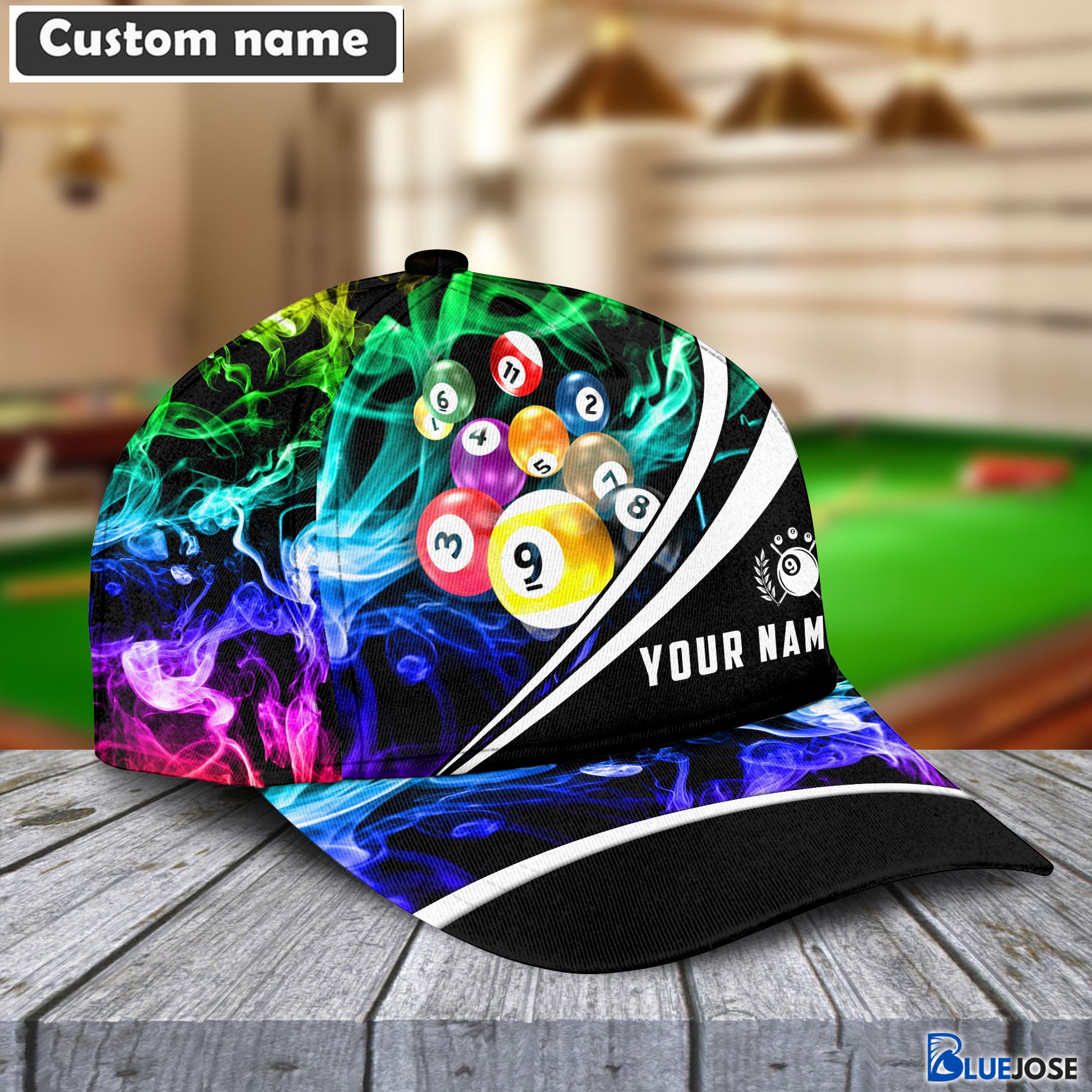 BlueJose Billiard 9 Ball Multicolor Smoke Pattern Personalized Name Cap