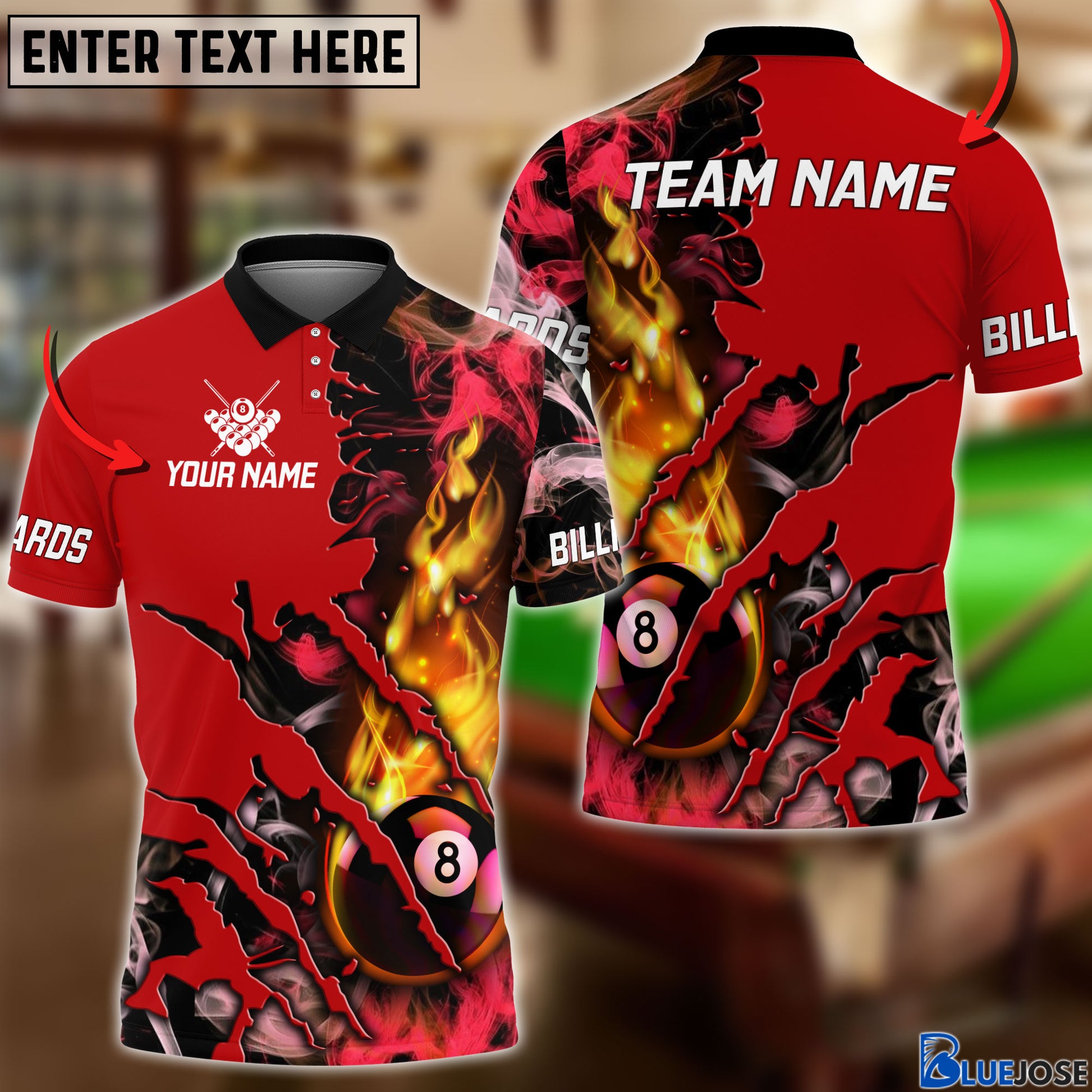BlueJose Billiards Flame Smoke Pattern Personalized Name, Team Name Unisex Shirt