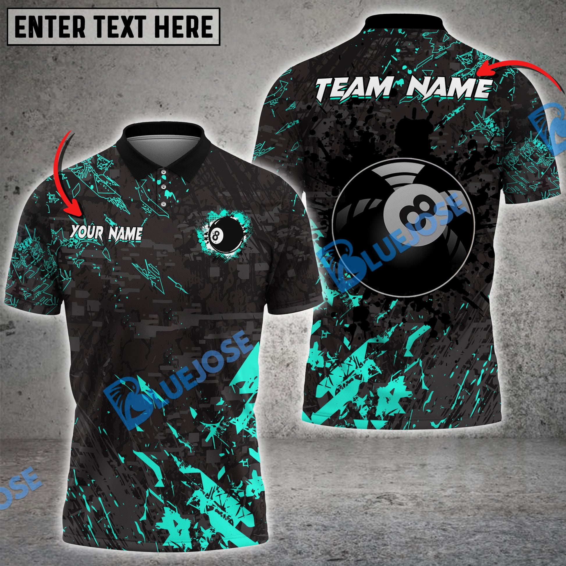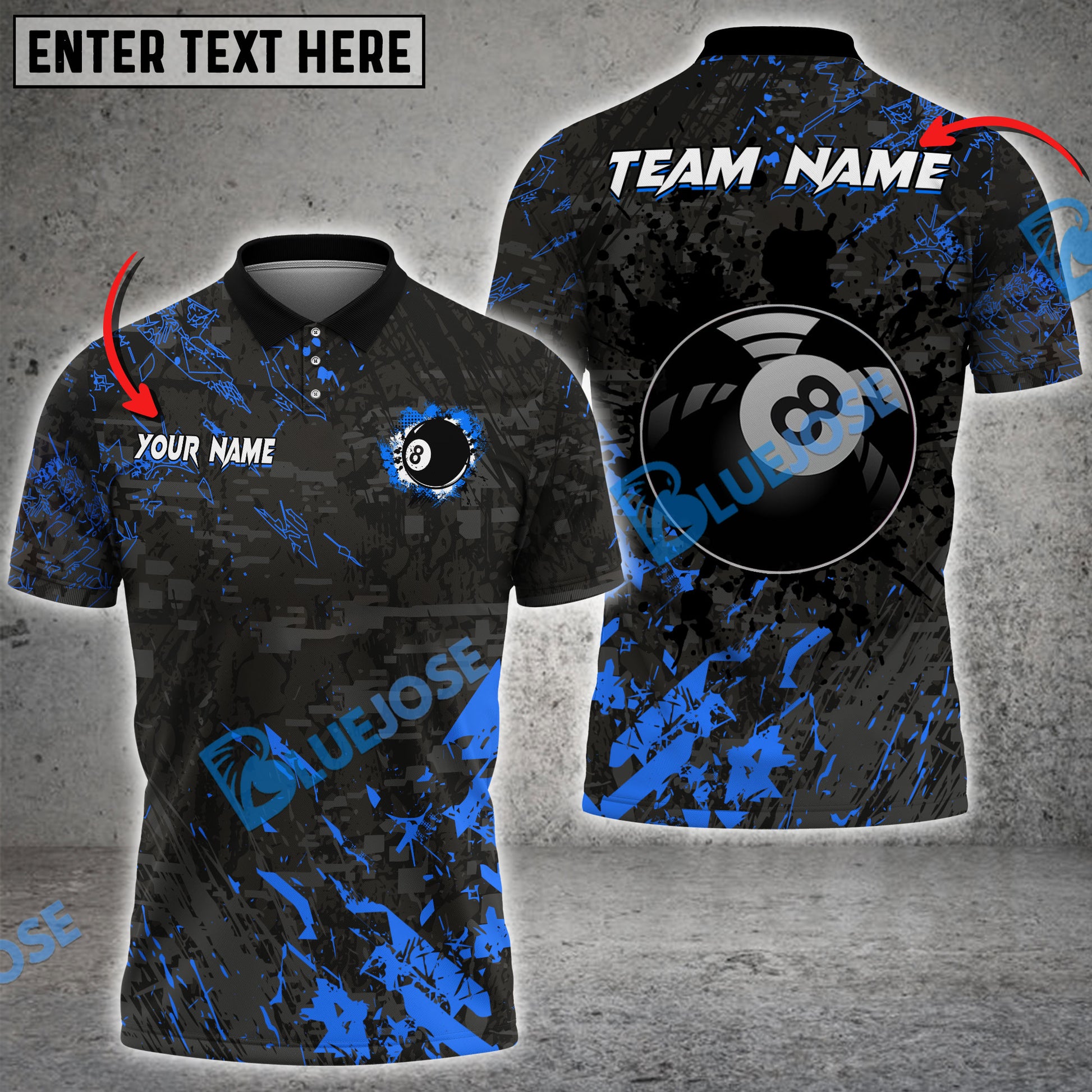 BlueJose Billiards 8 Ball Black Stains Grunge Personalized Name, Team Name Shirt (5 Colors)