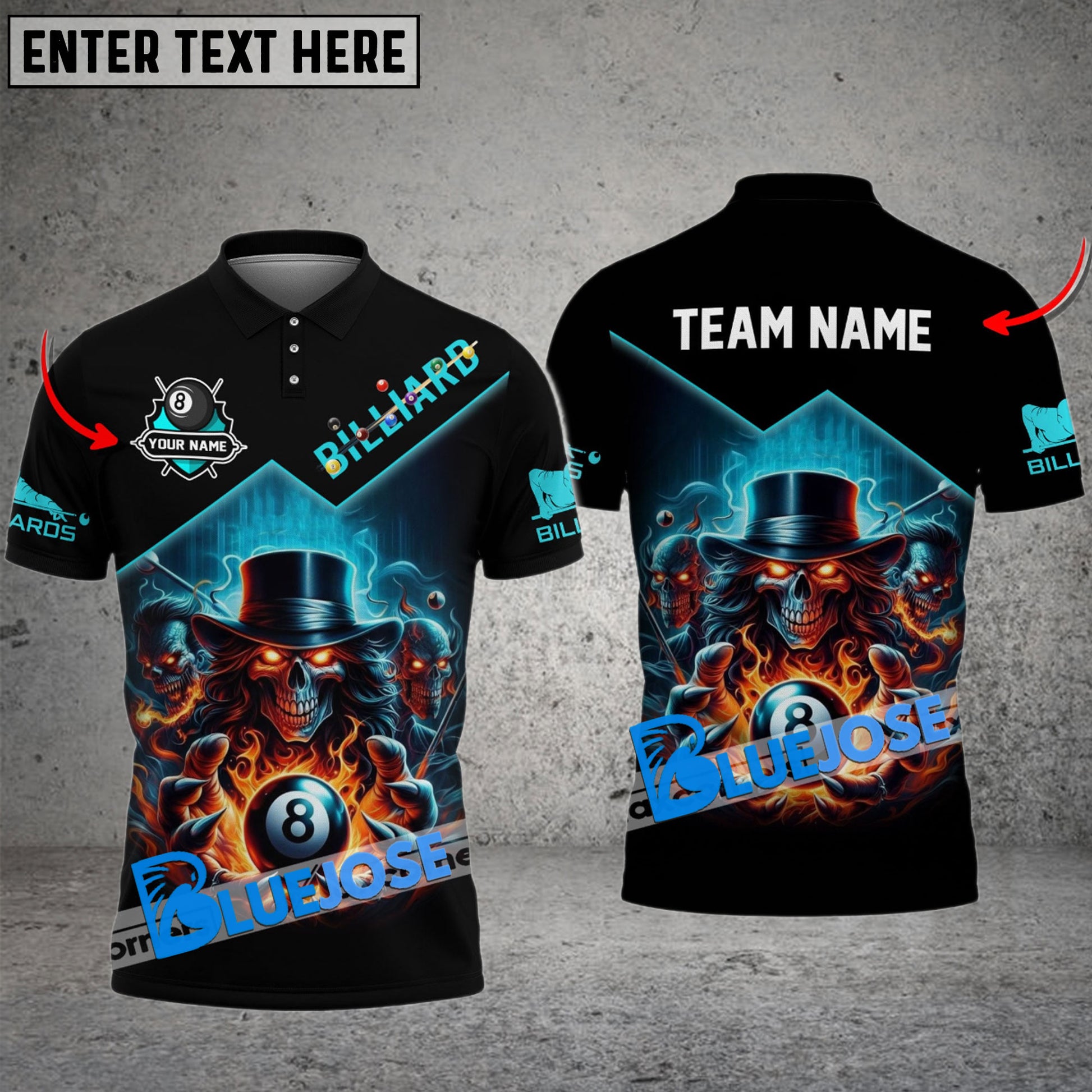BlueJose Billiards 8 Ball Hands Of Skull Flame Personalized Name, Team Name Unisex Shirt ( 4 Colors )