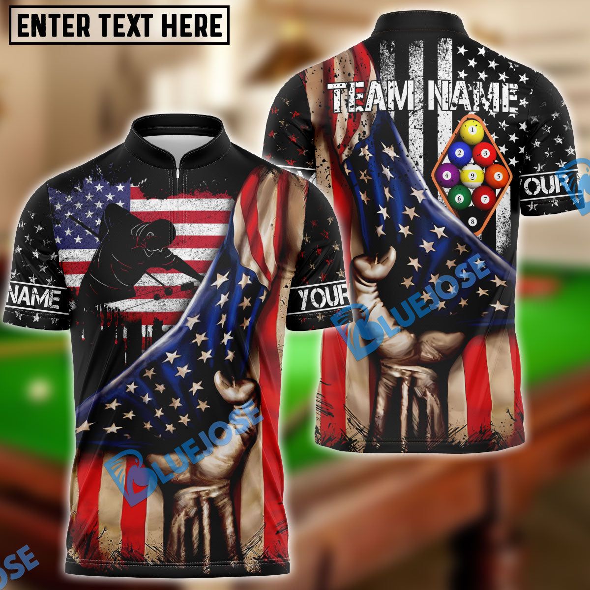 BlueJose Billiards American Flag 9 Ball Player Personalized Name, Team Name Shirt