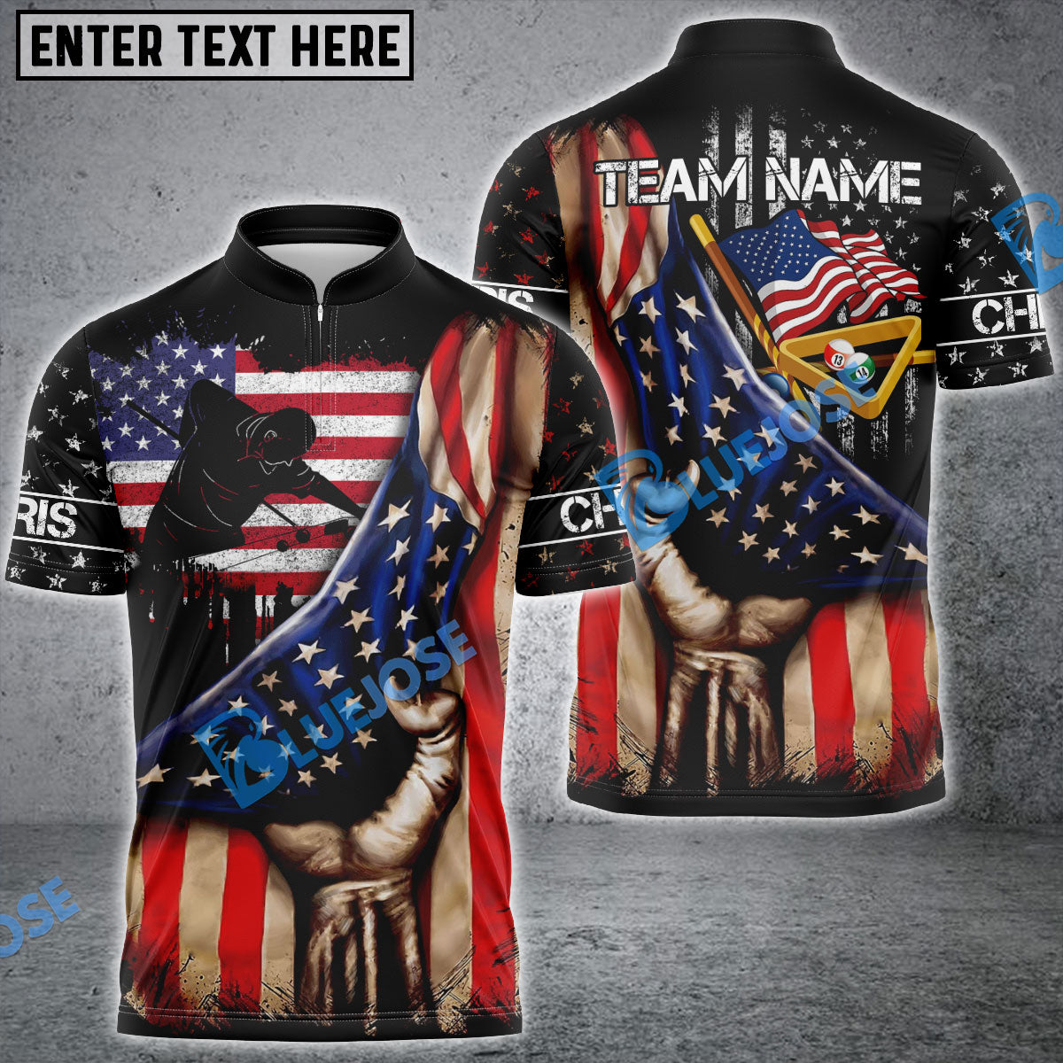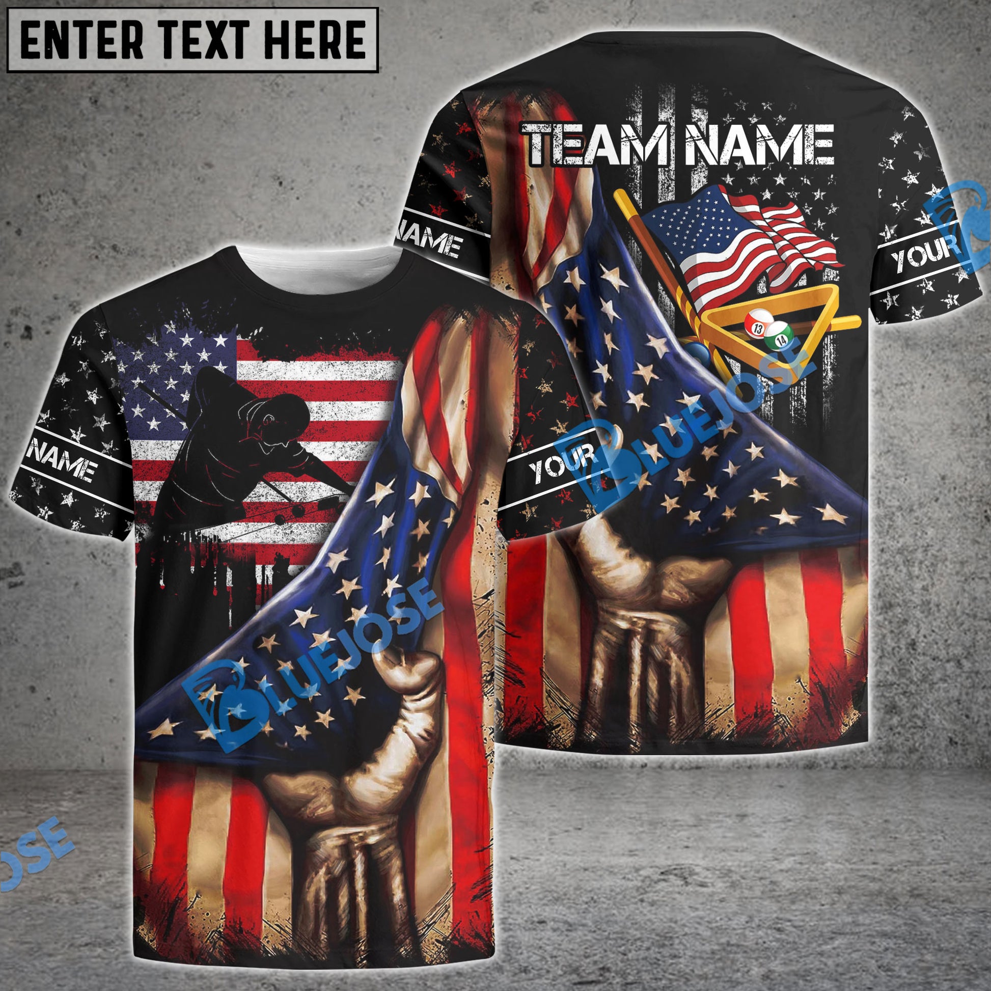 BlueJose Billiards American Flag Player Personalized Name, Team Name Shirt