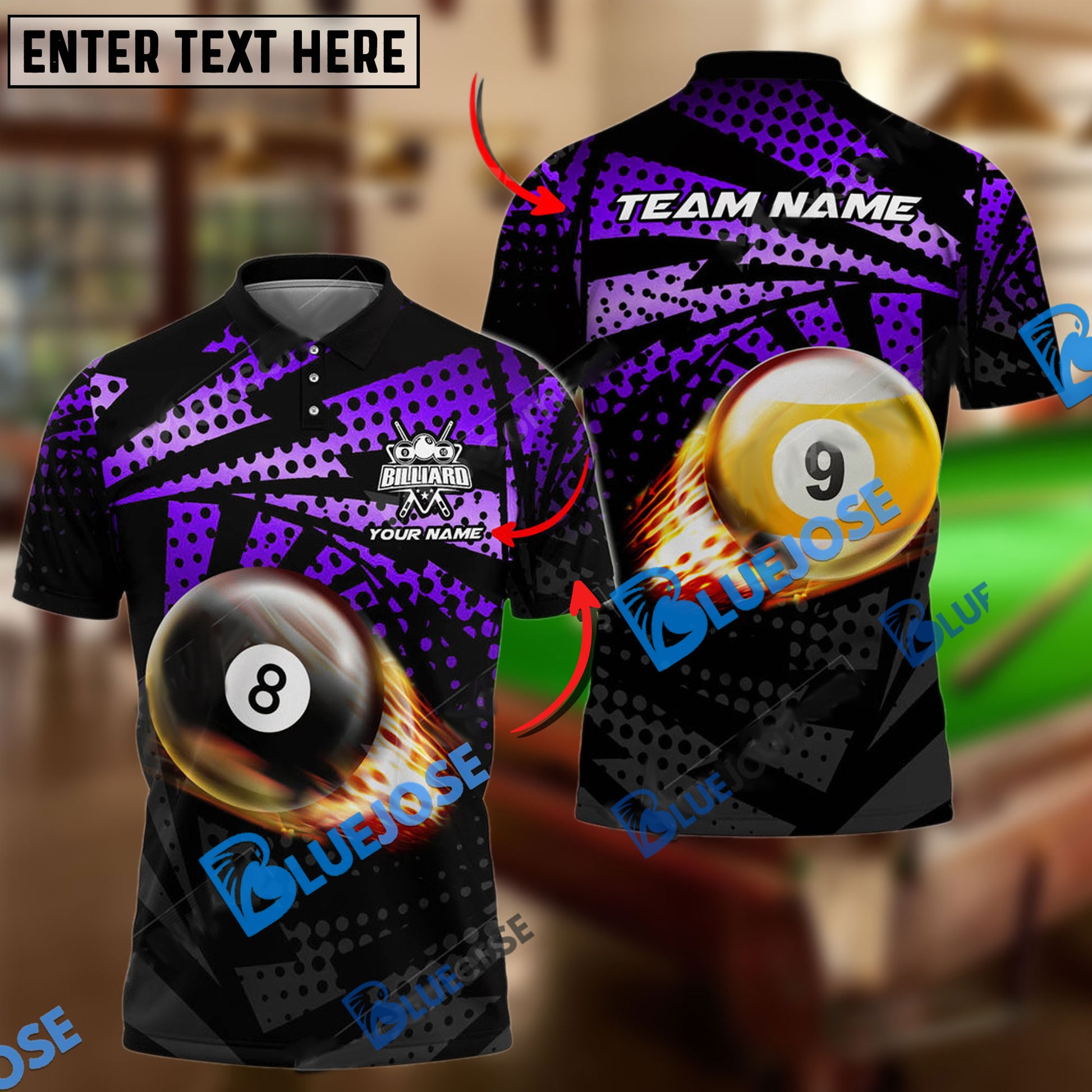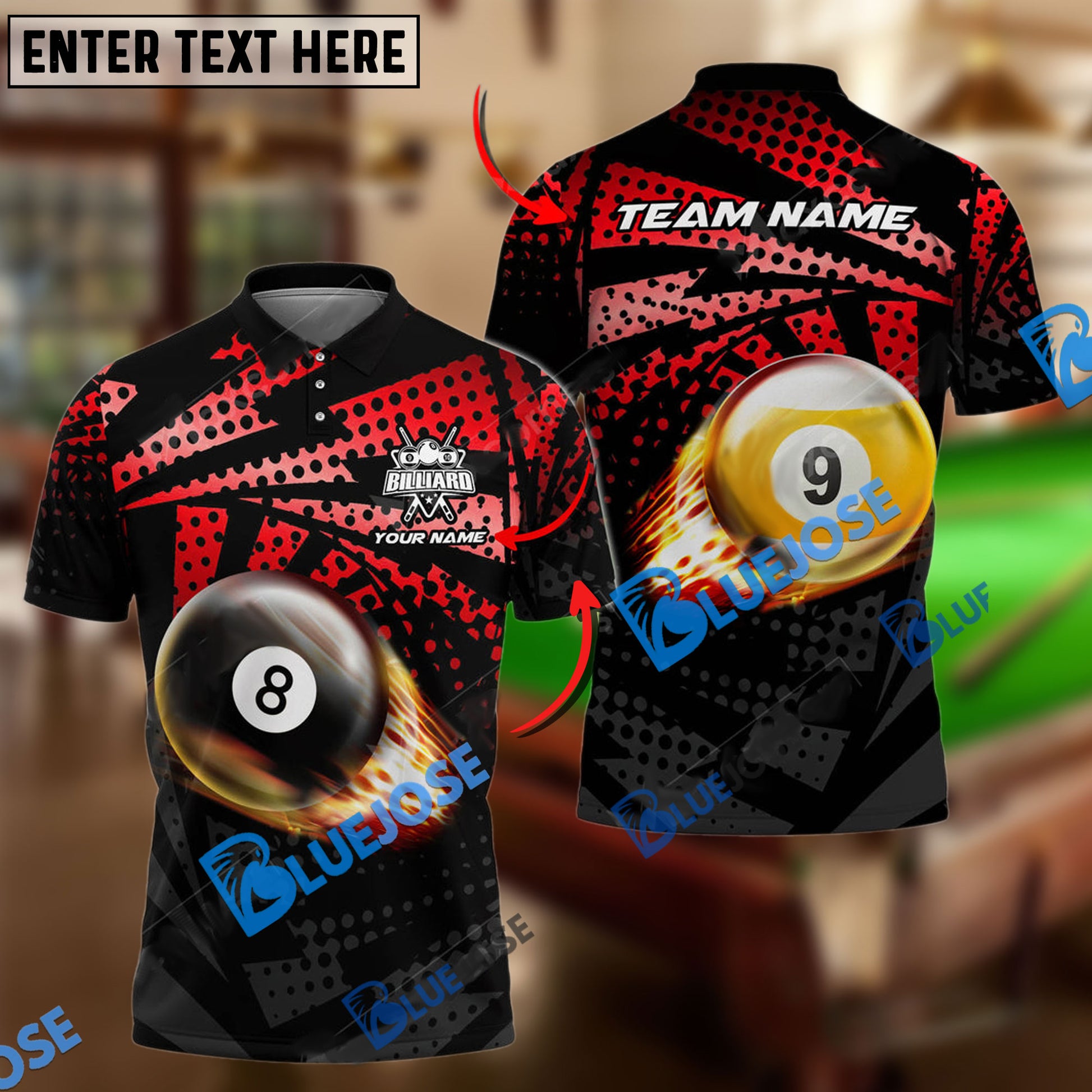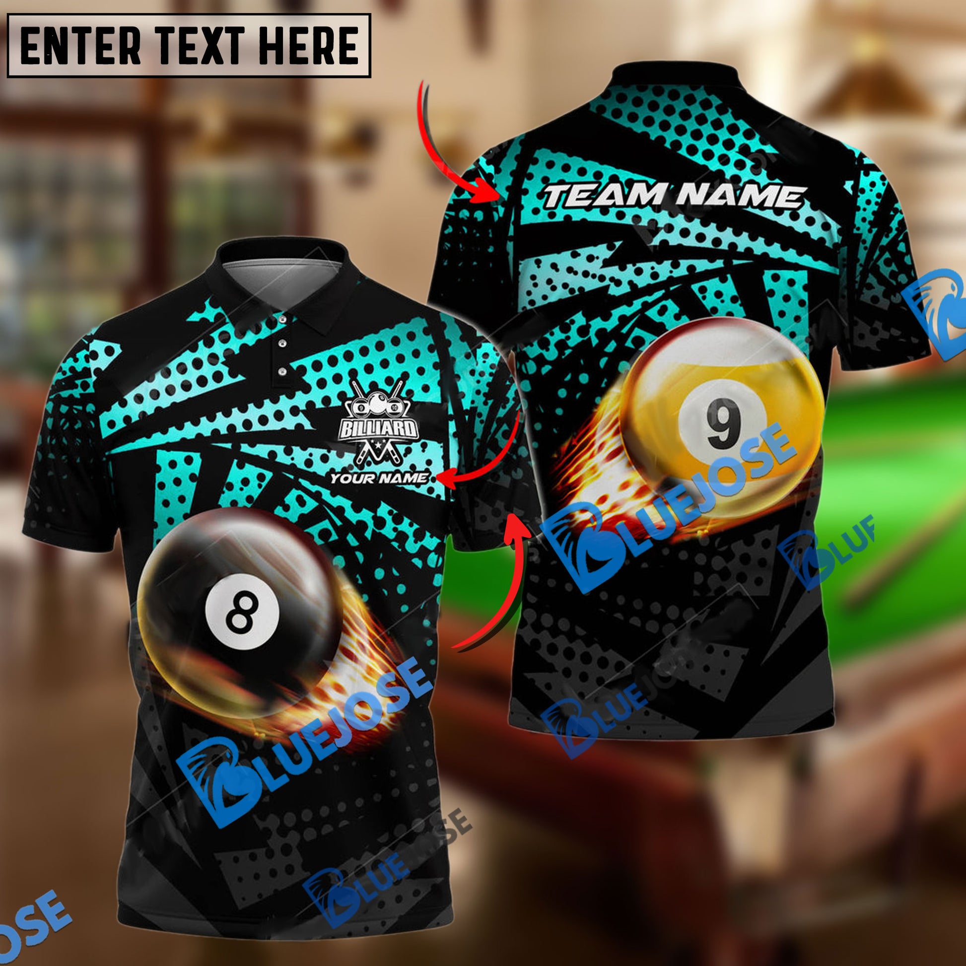 BlueJose Billiards Ball 8&9 Fire Point Strike Personalized Name, Team Name Unisex Shirt ( 4 Colors )