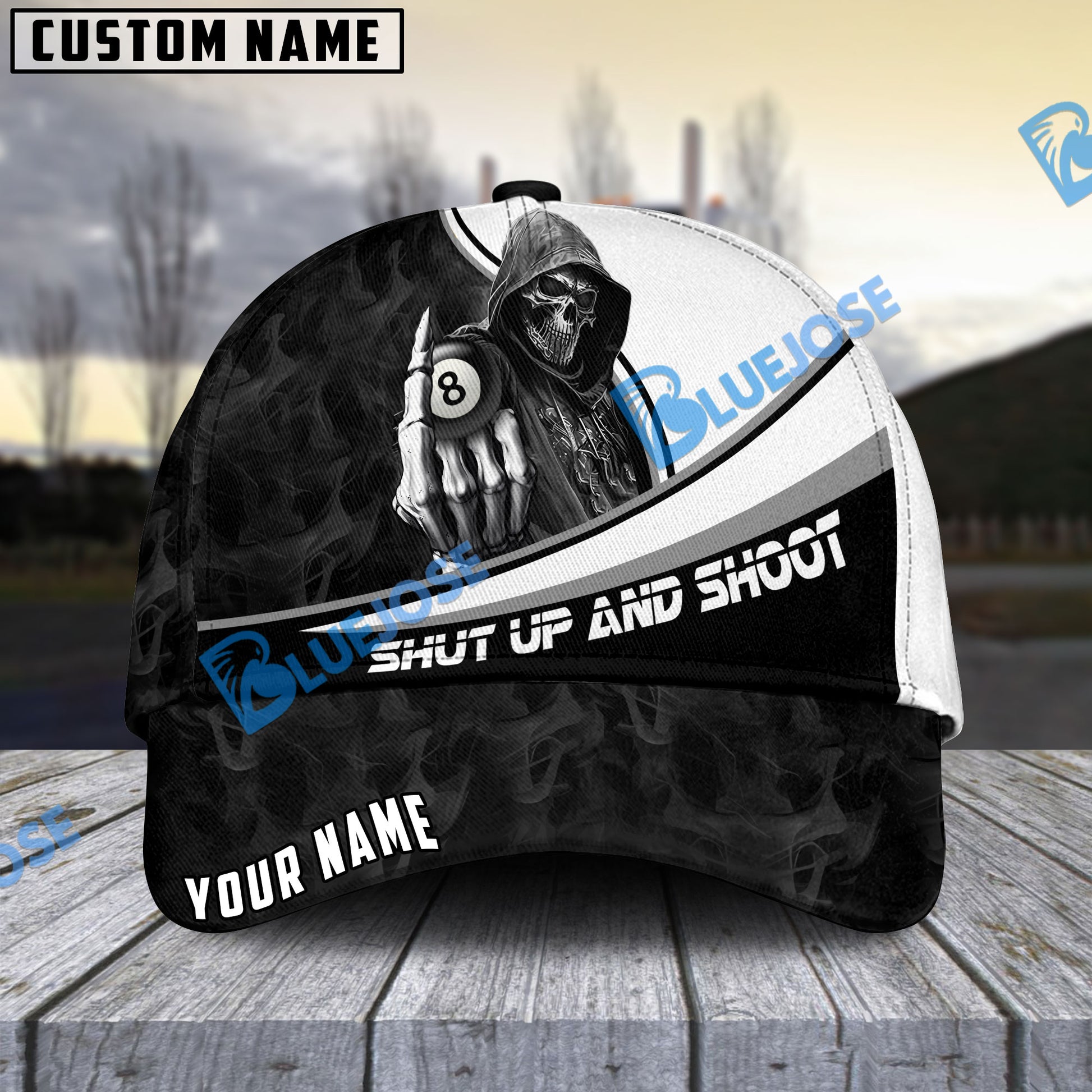 BlueJose Billiards Ball 8 Hooded Skull Personalized Name Cap (4 Colors)