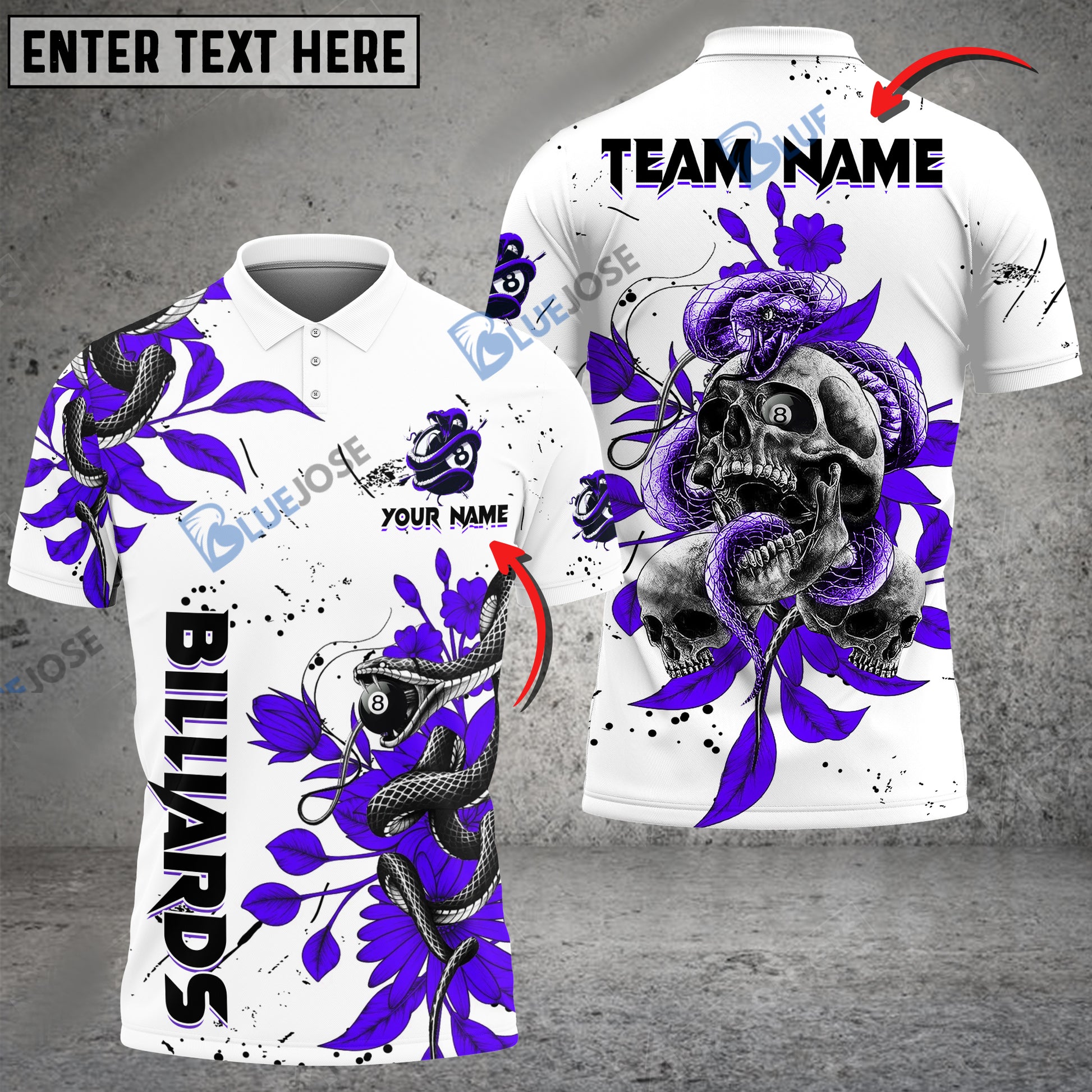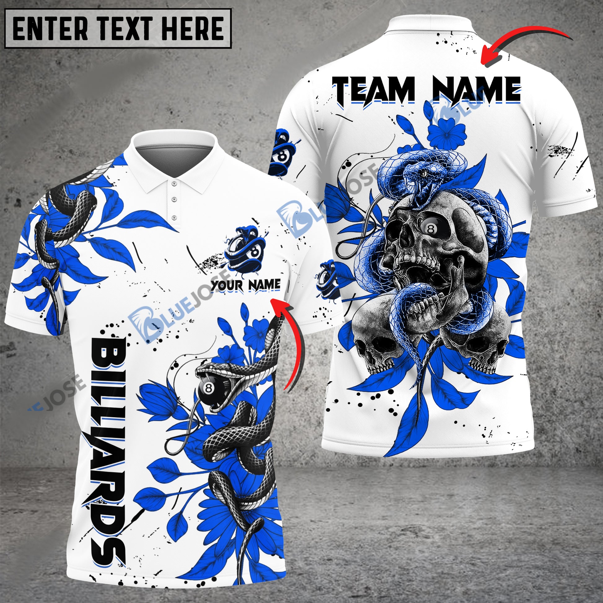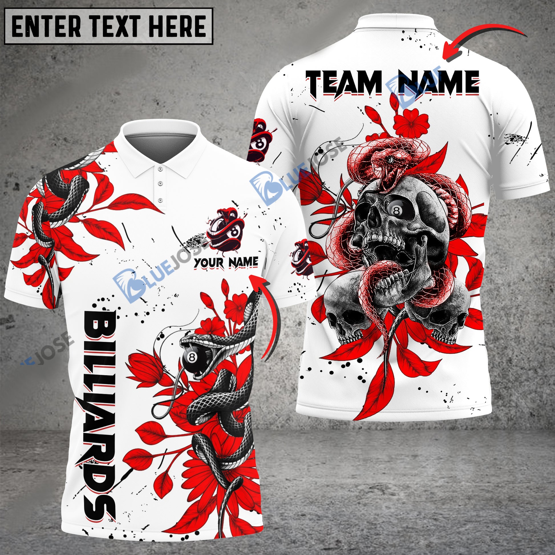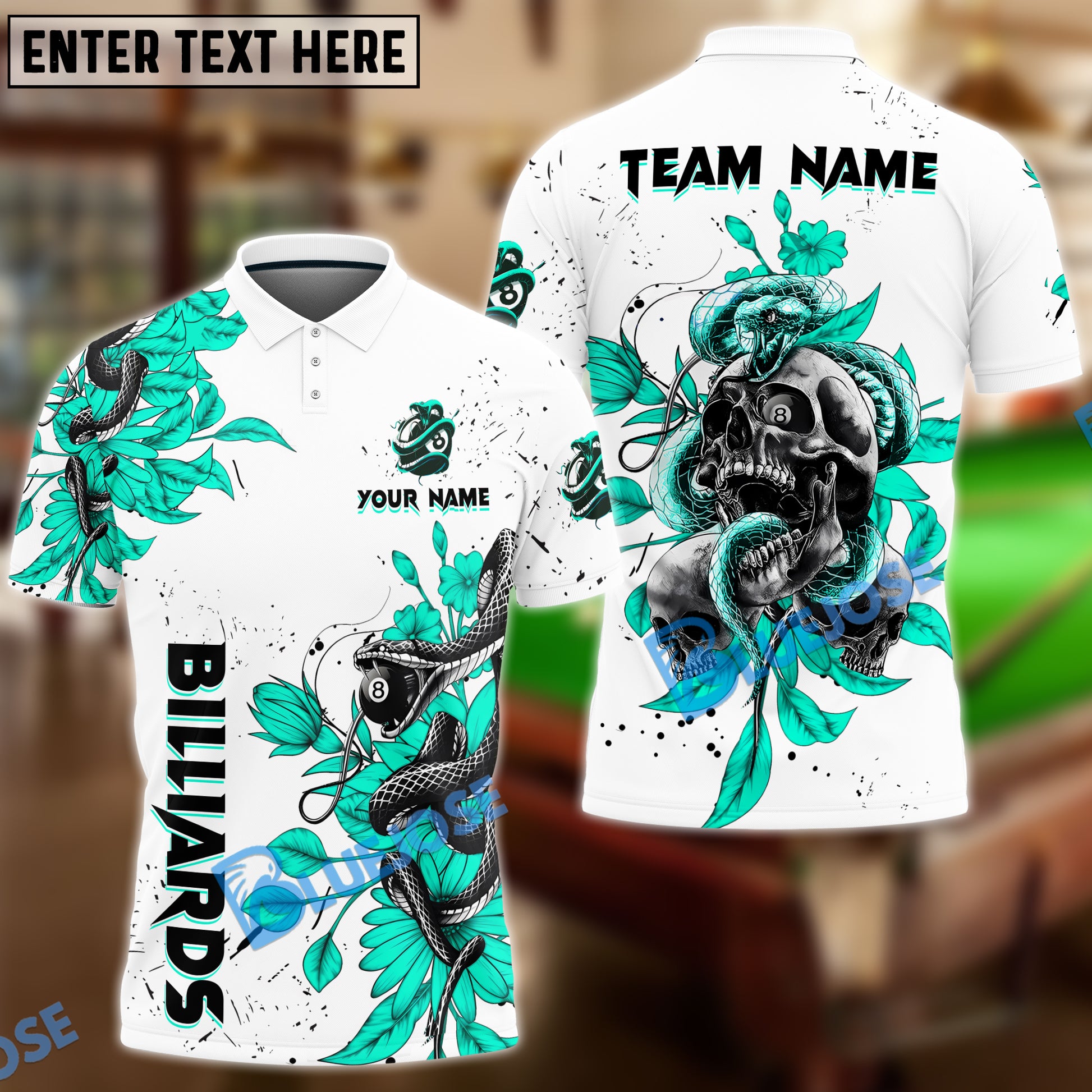 BlueJose Billiards Ball 8 Snake Skull Tattoo Art Personalized Name, Team Name Unisex Shirt ( 4 Colors )
