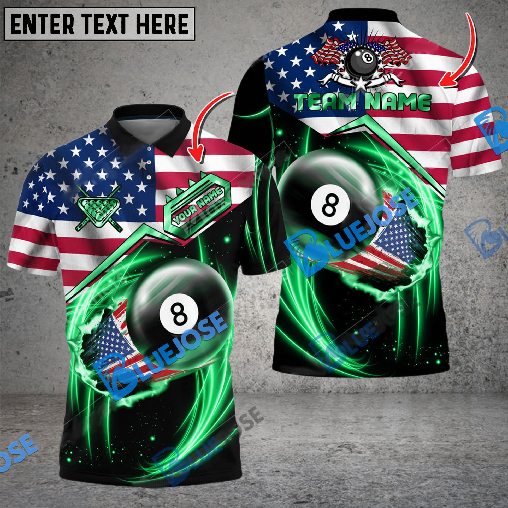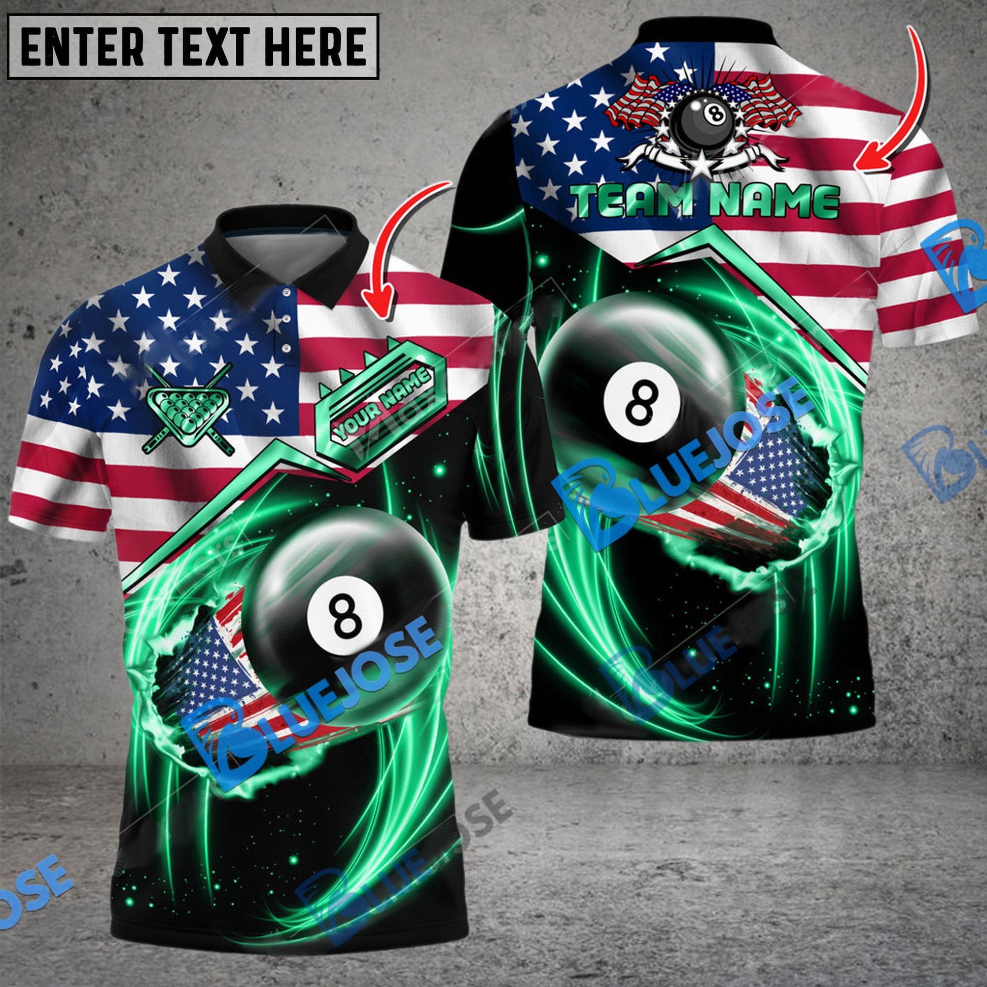 BlueJose Billiards Ball 8 US Flag Flame Personalized Name, Team Name Unisex Shirt ( 6 Colors )
