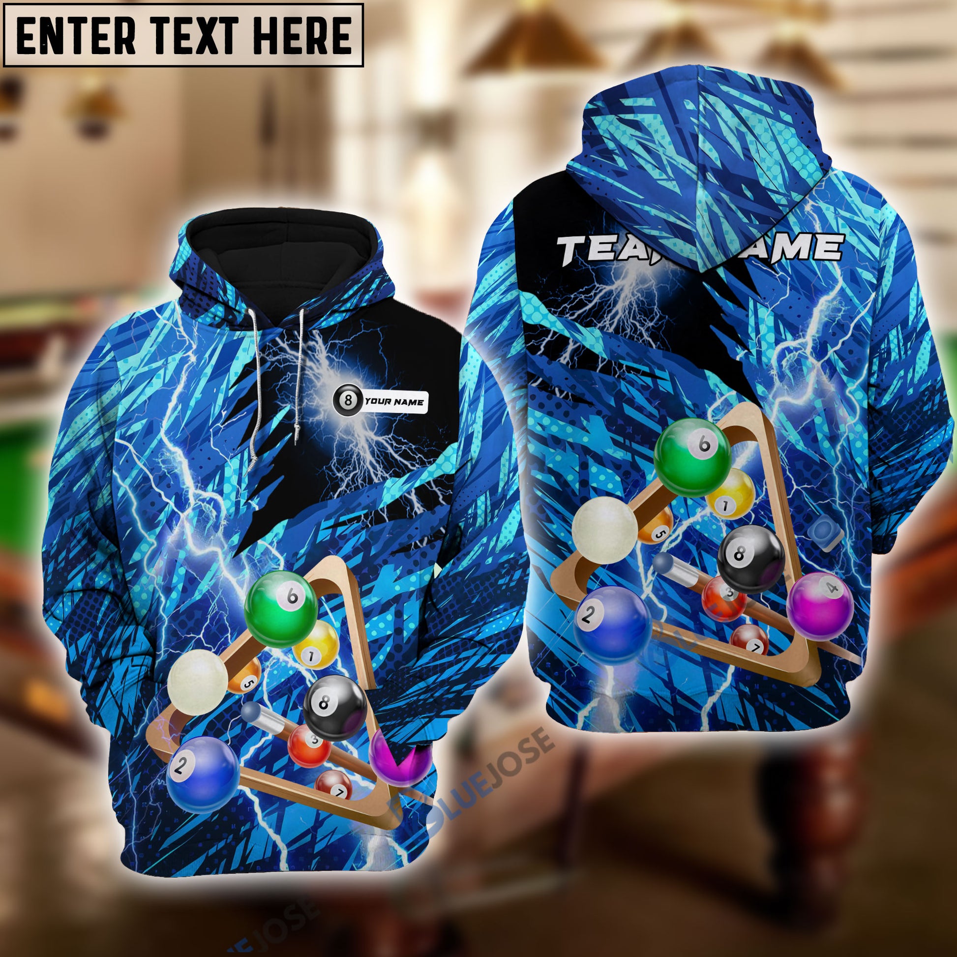 BlueJose Billiards Blue Lightning Personalized Name, Team Name Unisex Shirt