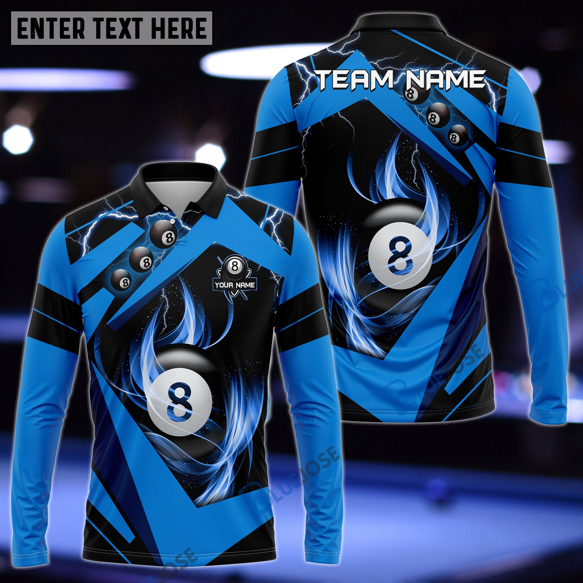 BlueJose Billiards Blue Lightning Personalized Name, Team Name Unisex Shirt