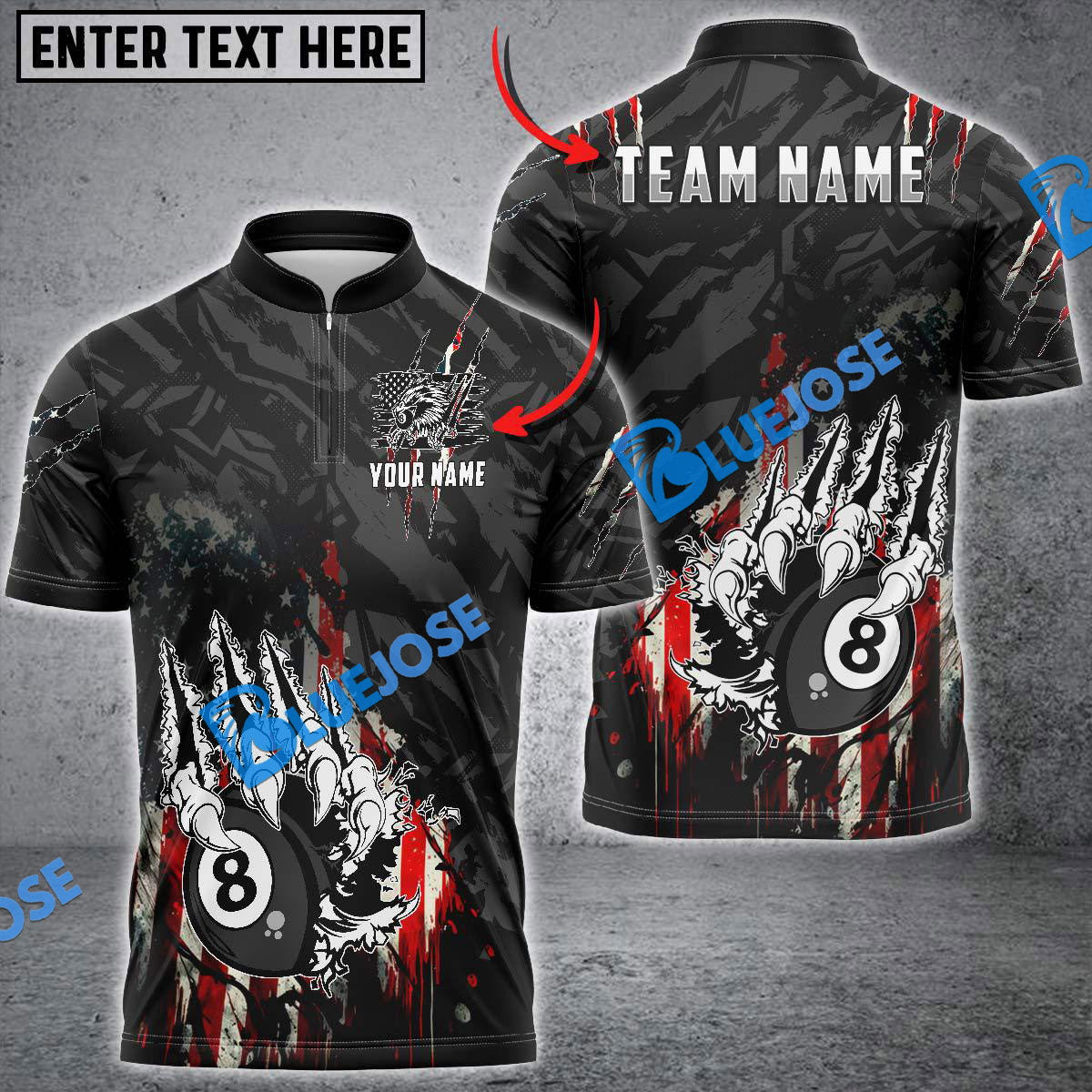 BlueJose Billiards Claws Tearing US Flag Personalized Name, Team Name Unisex Shirt