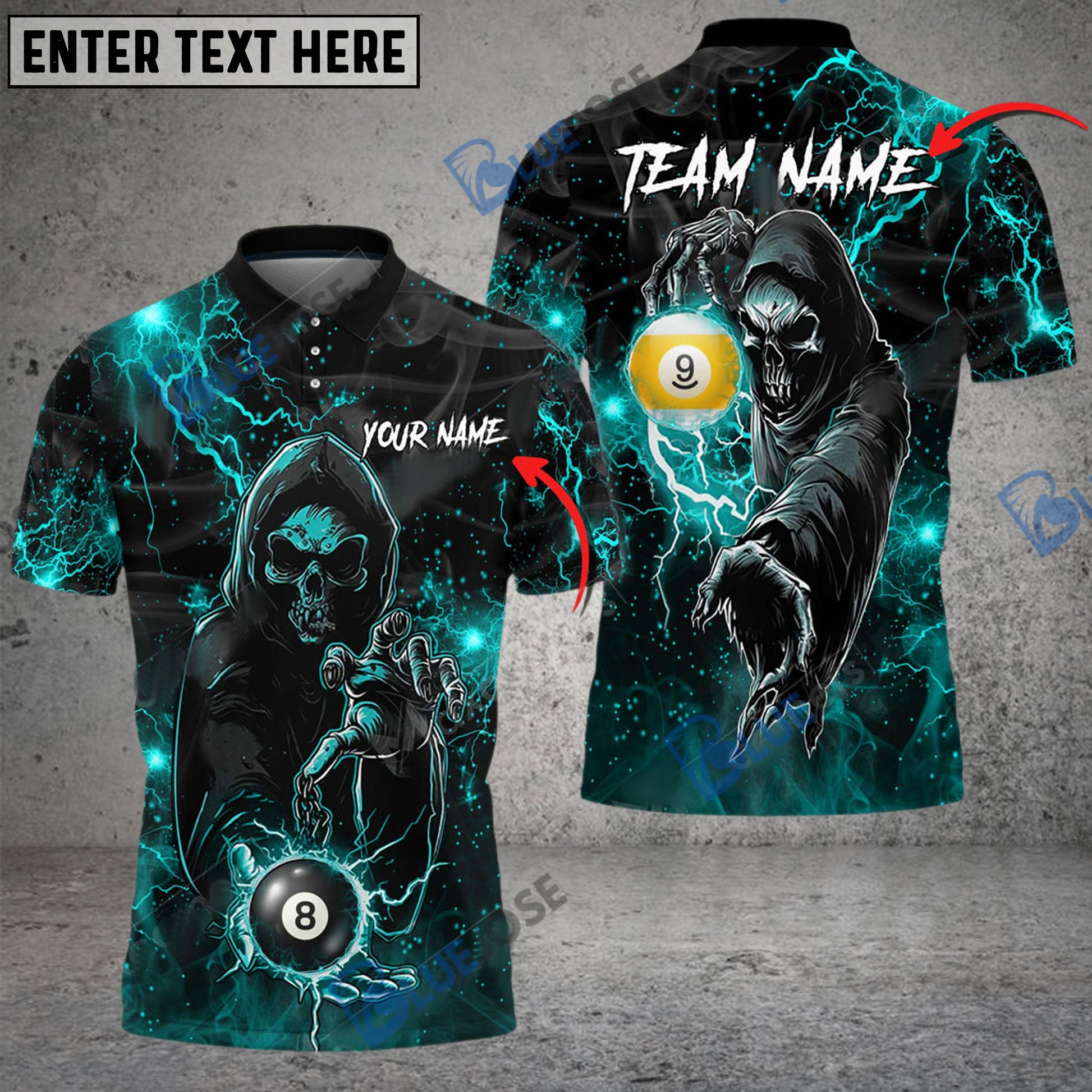 BlueJose Billiards Thunder Skull Personalized Name, Team Name Unisex Shirt ( 6 Colors )