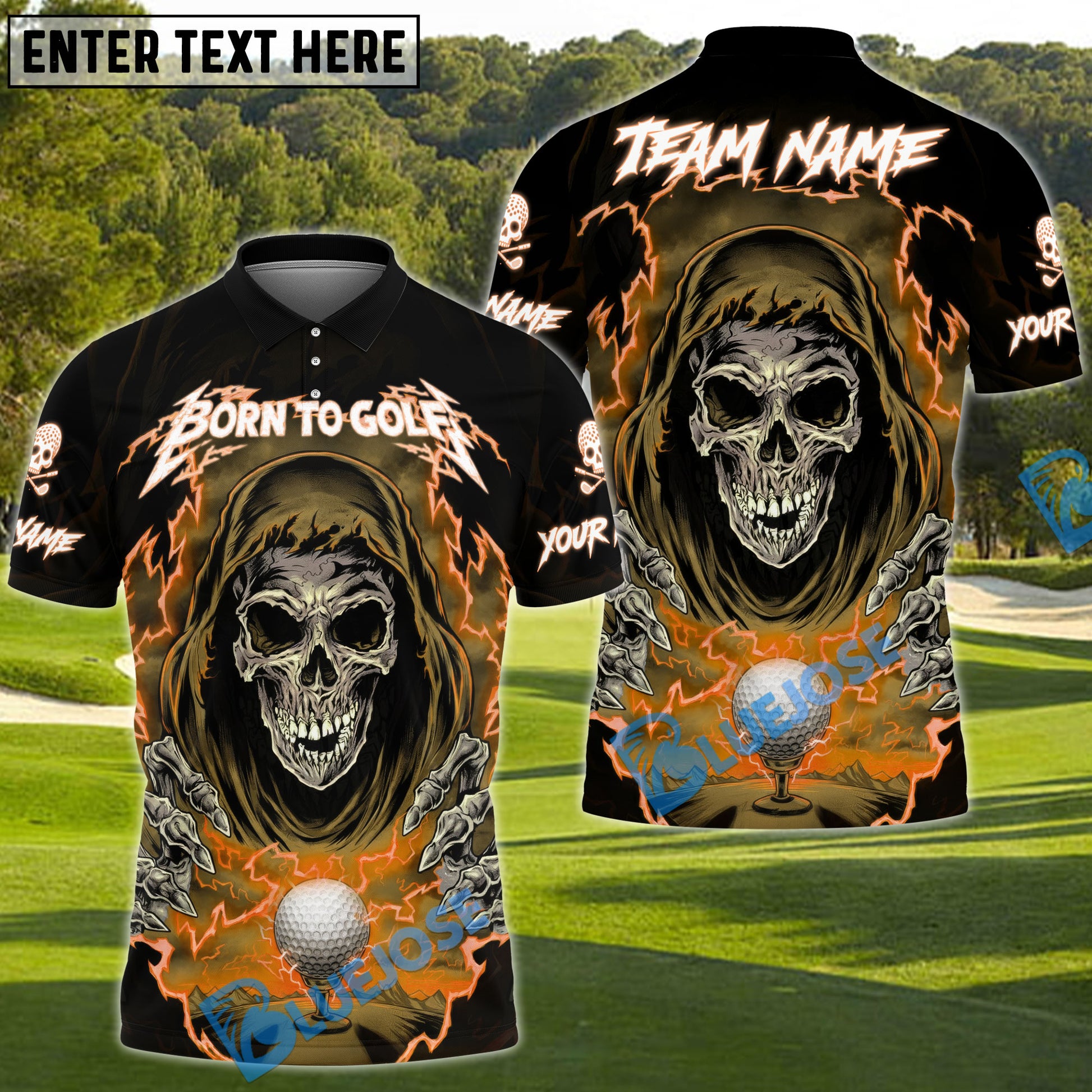 BlueJose Born to Golf Reaper Polo Shirt, Customized Name & Team Name 3D Shirts (4 Colors)