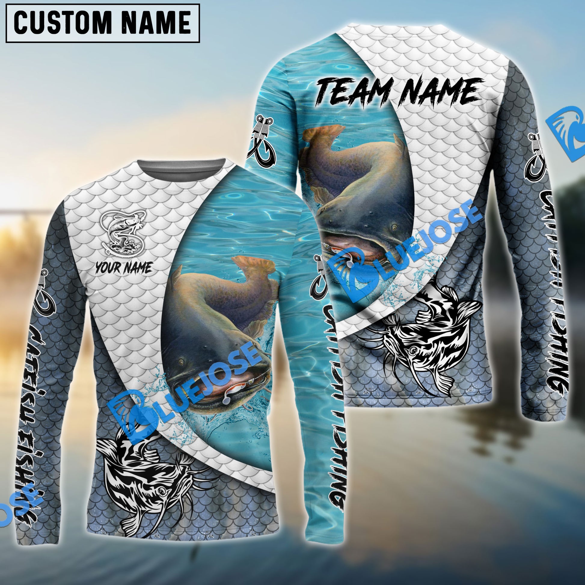 Bluejose Catfish Fishing White Skin Diagonal Custom Name & Team Name 3D Shirts