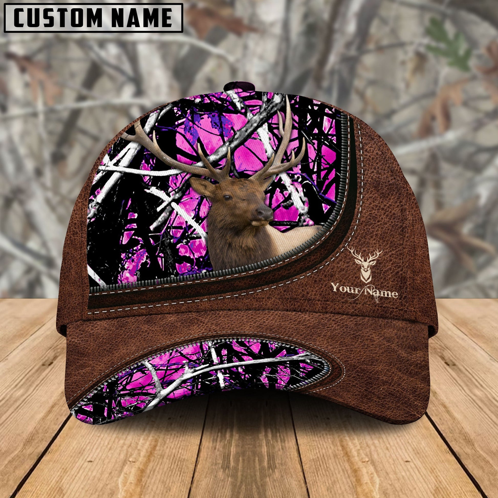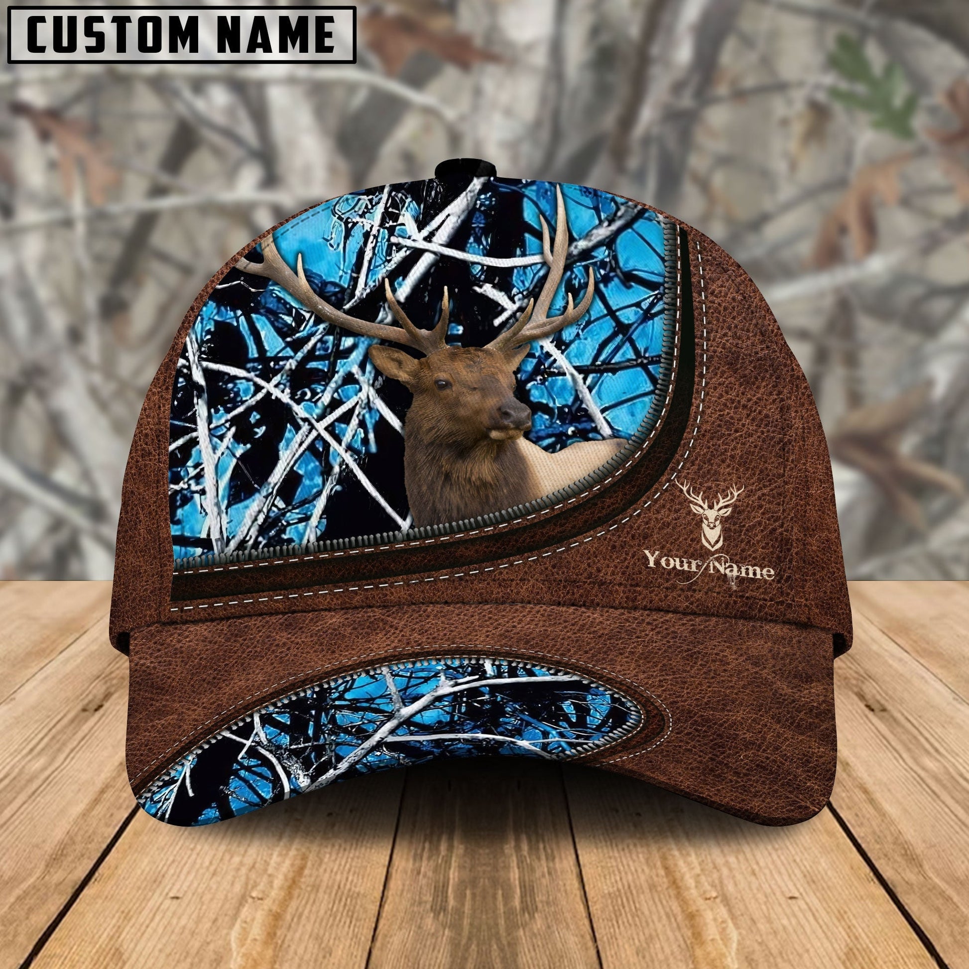 BlueJose Elk Hunting Leather Zip Pattern Personalized Name Cap