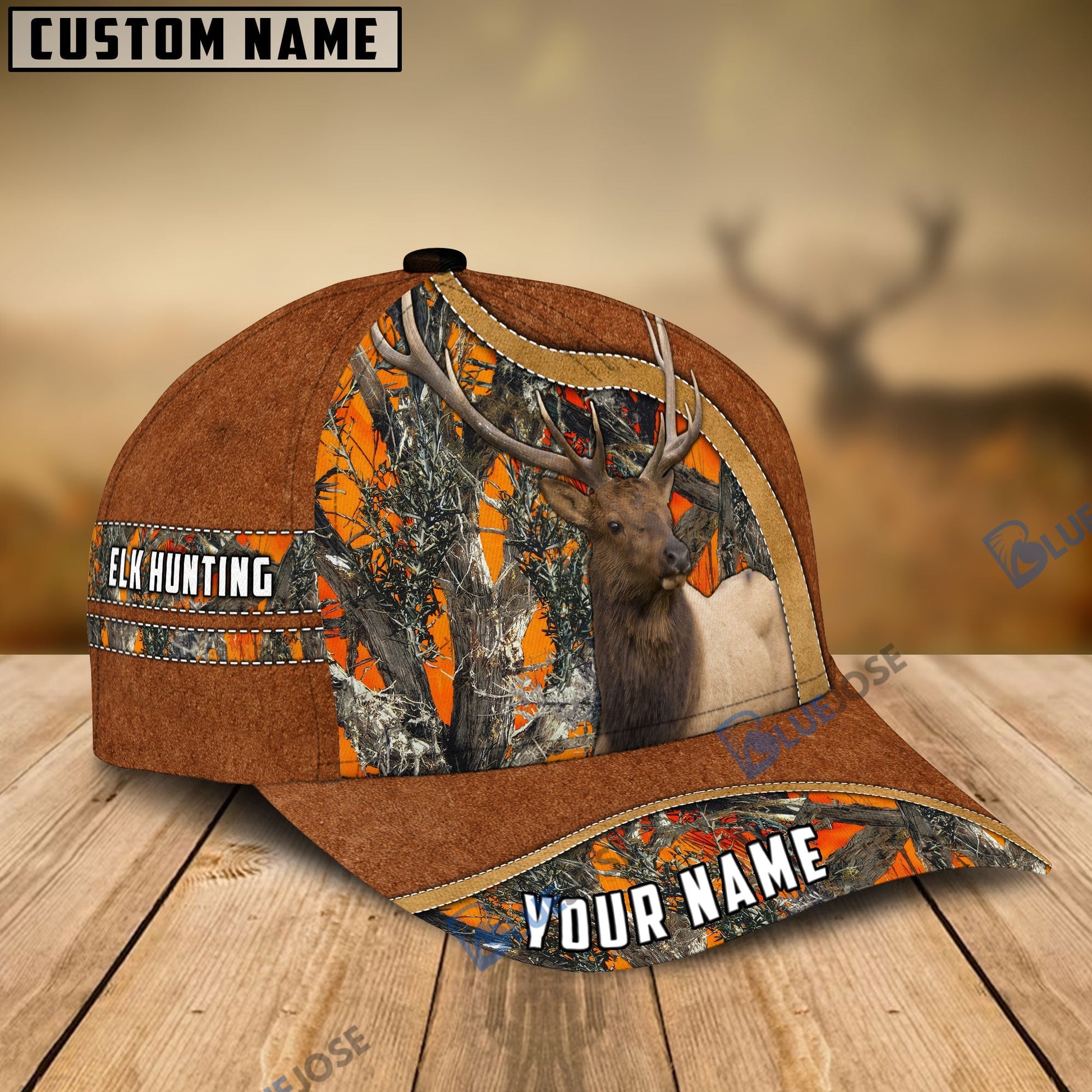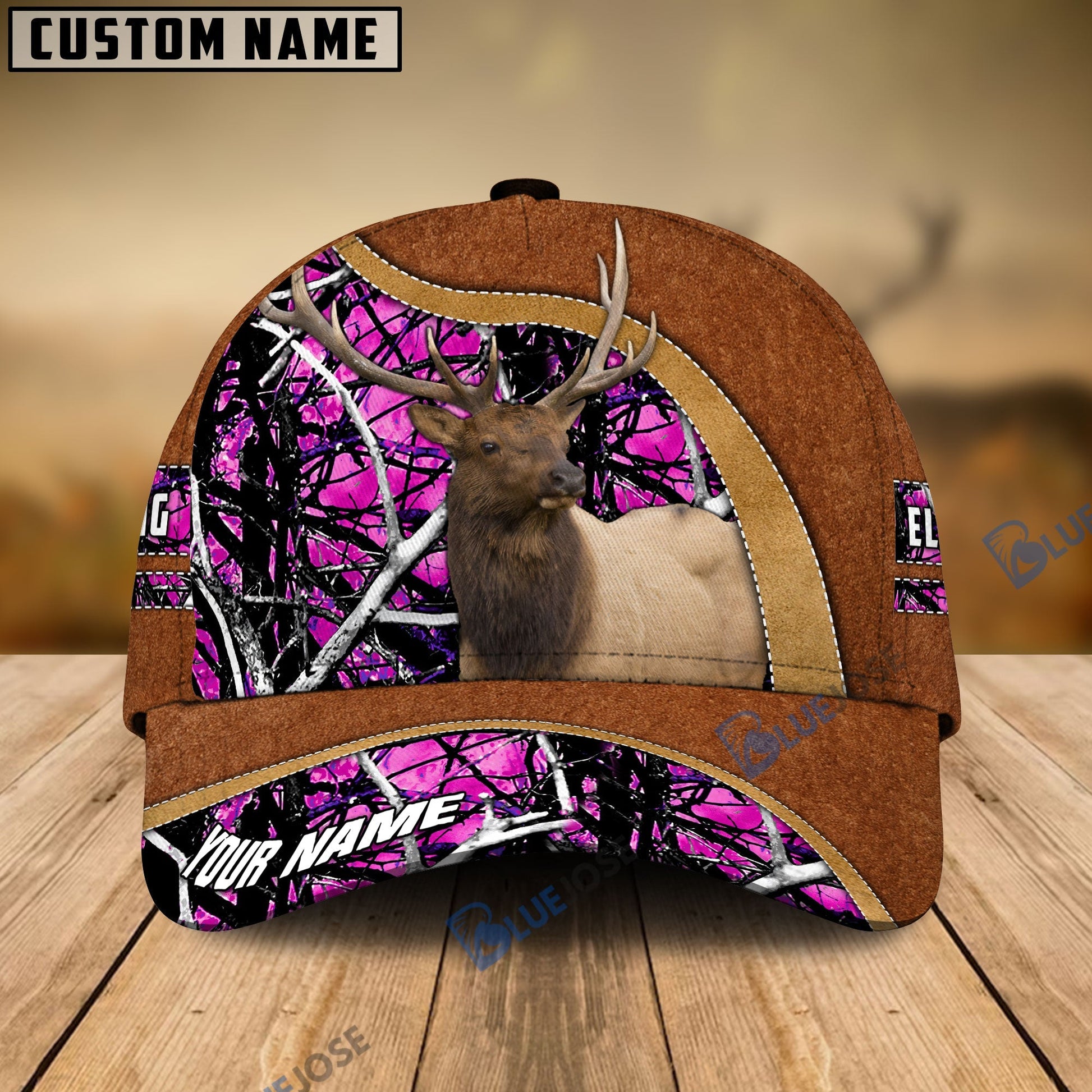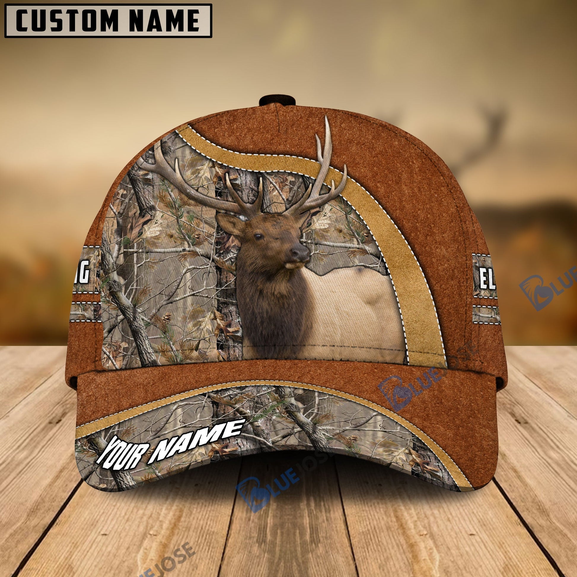 BlueJose Elk Hunting Light Brown Leather Pattern Personalized Name Cap