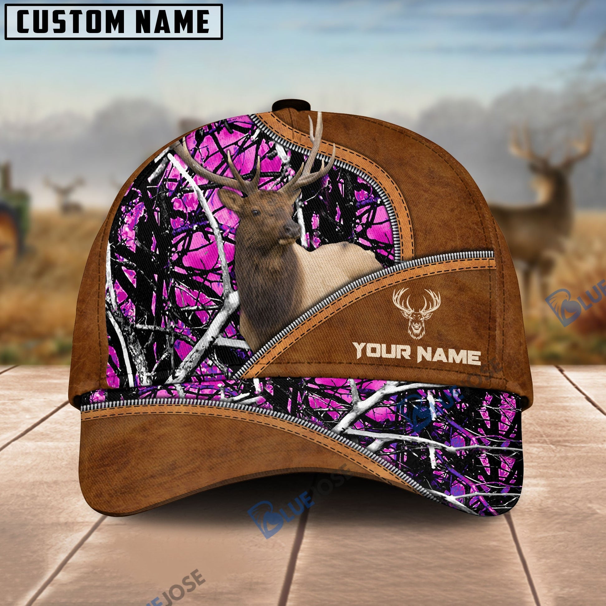 BlueJose Elk Hunting Premium Brown Leather Pattern Personalized Name Cap