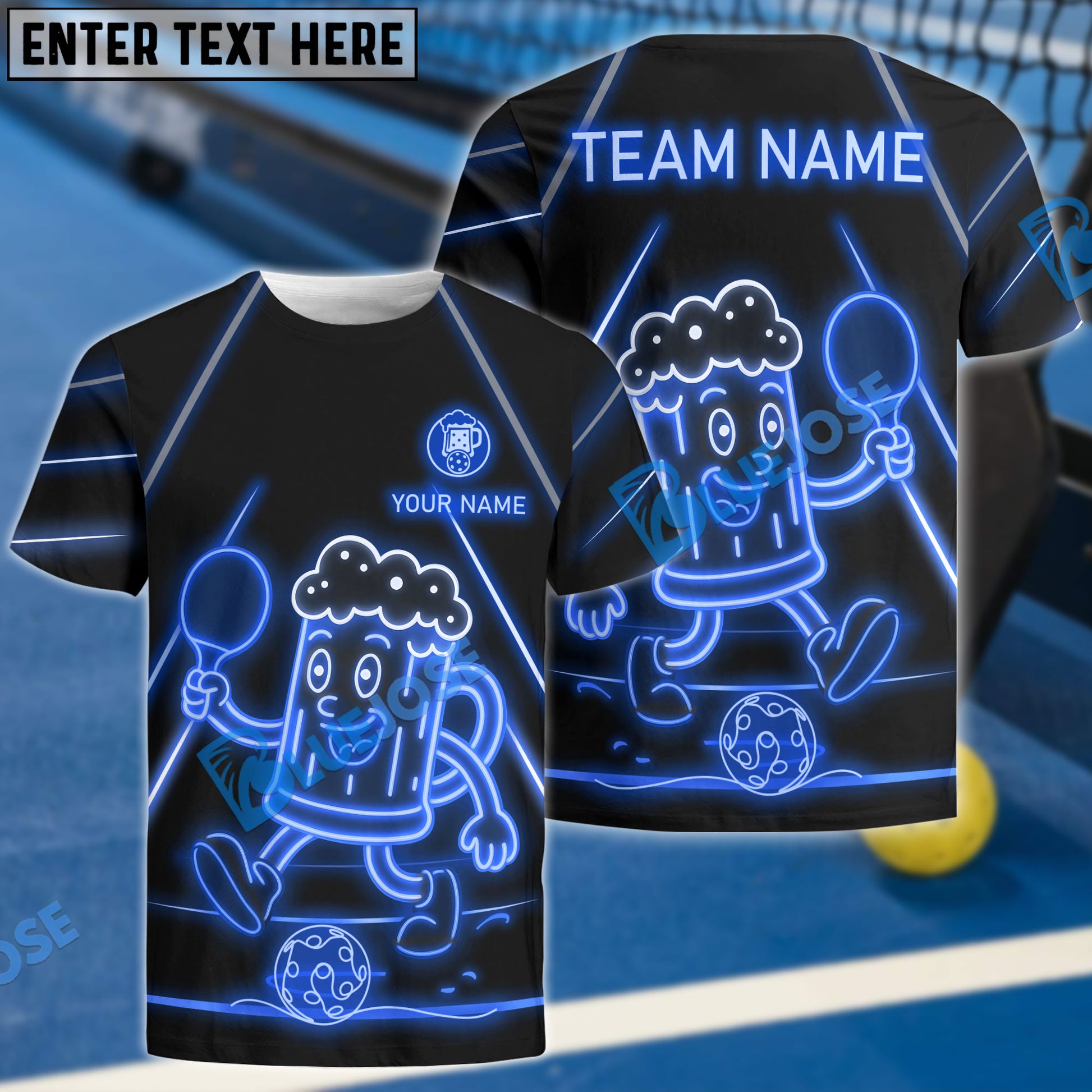 BlueJose Funny Beer Pickleball Shirt Neon Mascot Style Multicolor Options Customized Name & Team Name 3D Shirts