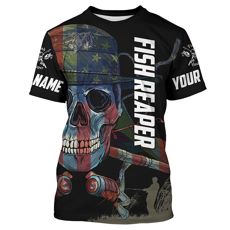 BlueJose Halloween American Flag Fish Skull Reaper Fishing Custom Name Long Sleeve Fishing Shirts