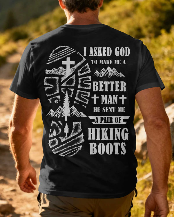 BlueJose I Asked God To Make Me A Better Man He Sent Me A Pair Of Hiking Boots Personalized Hiking 3D Shirt - Black