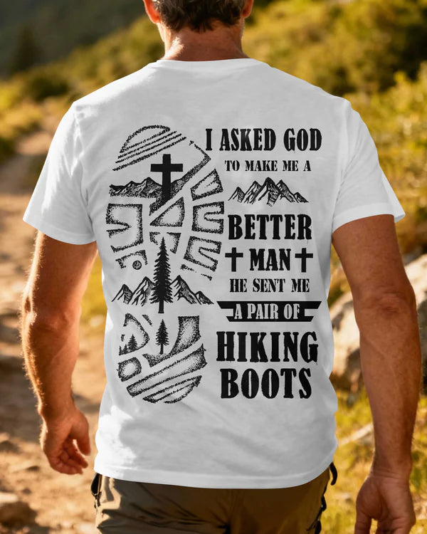 BlueJose I Asked God To Make Me A Better Man He Sent Me A Pair Of Hiking Boots Personalized Hiking 3D Shirt - White
