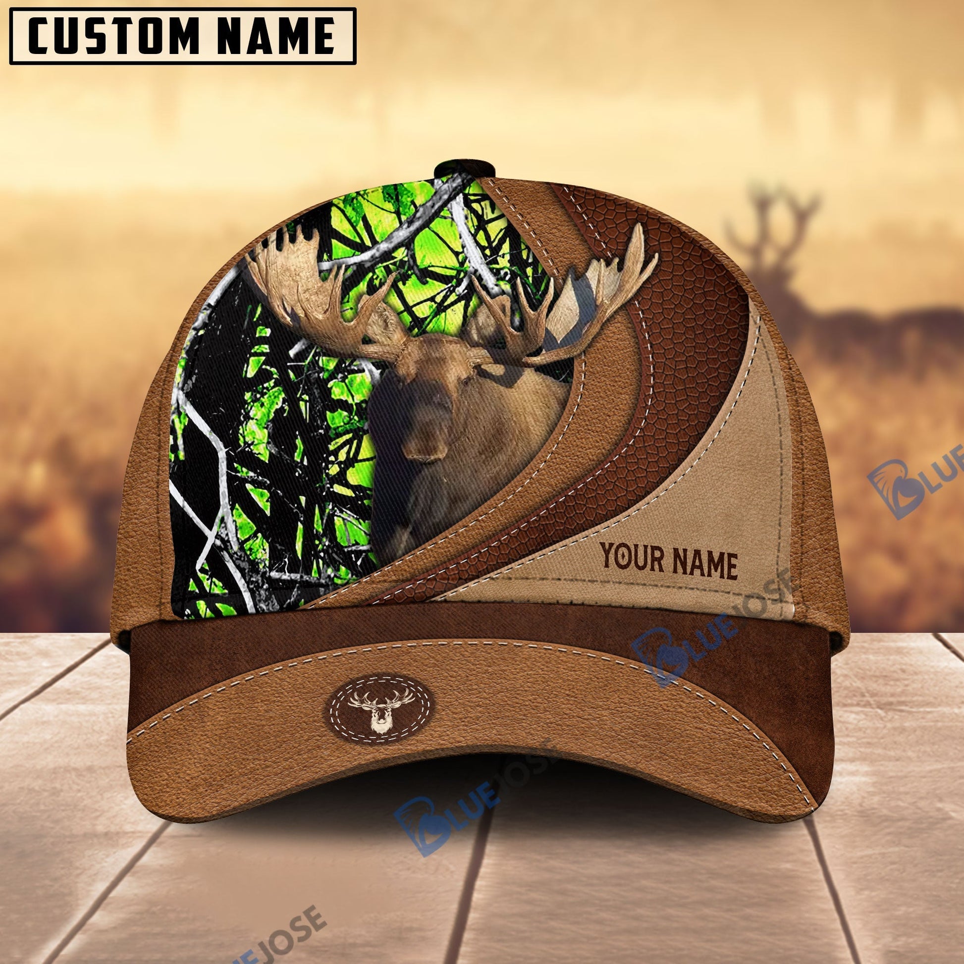 BlueJose Moose Hunting Brown Leather Pattern Personalized Name Cap (5 Colors)
