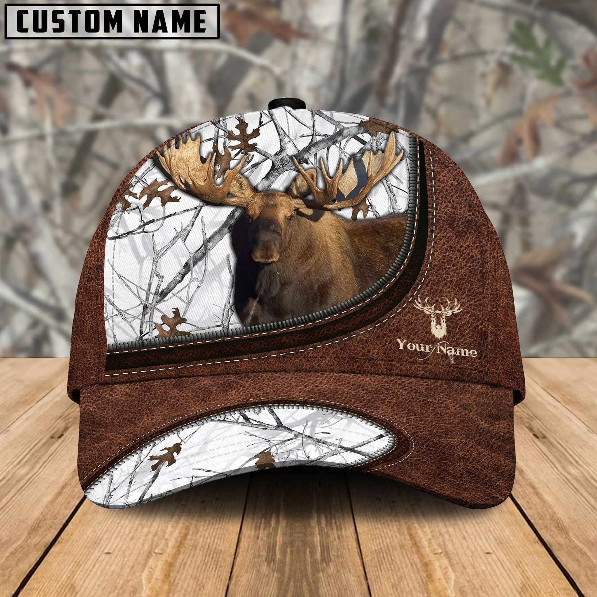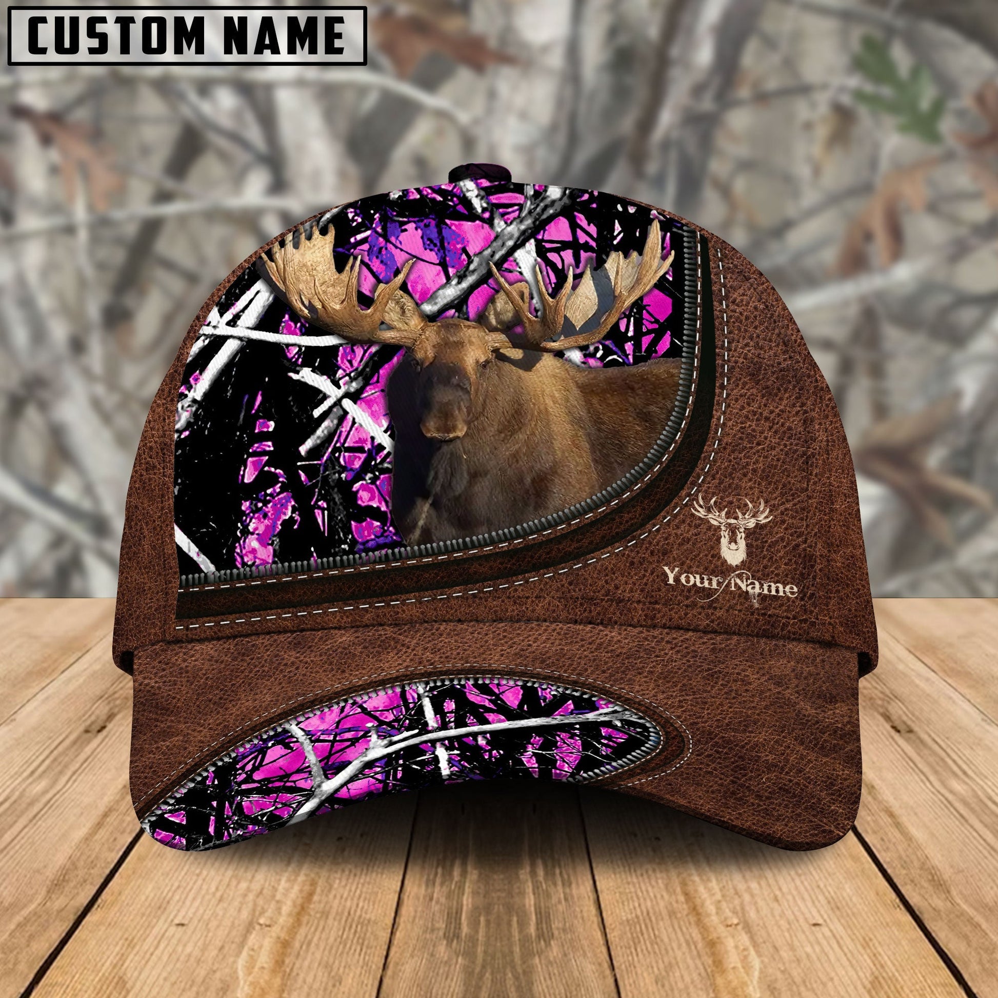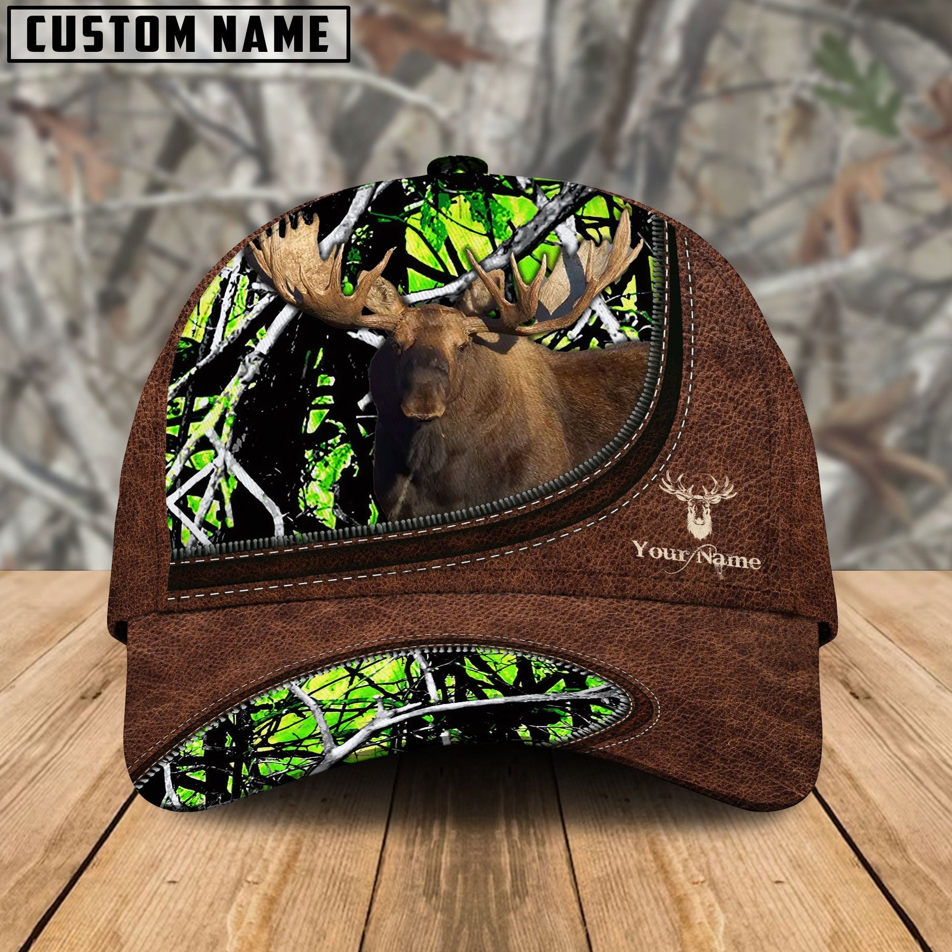BlueJose Moose Hunting Leather Zip Pattern Personalized Name Cap
