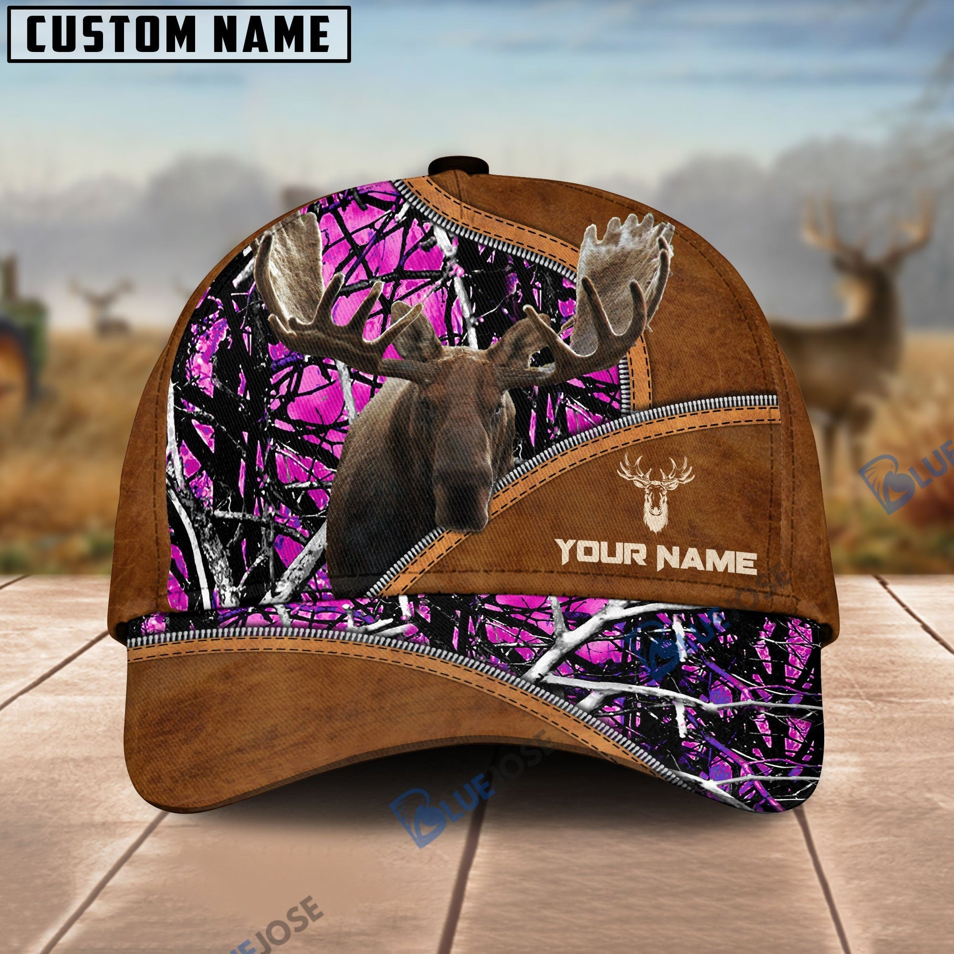BlueJose Moose Hunting Premium Brown Leather Pattern Personalized Name Cap