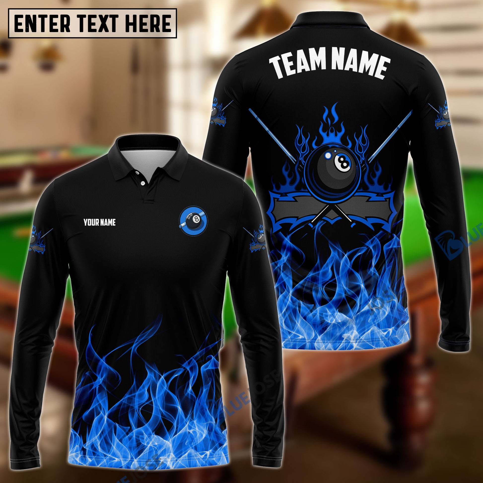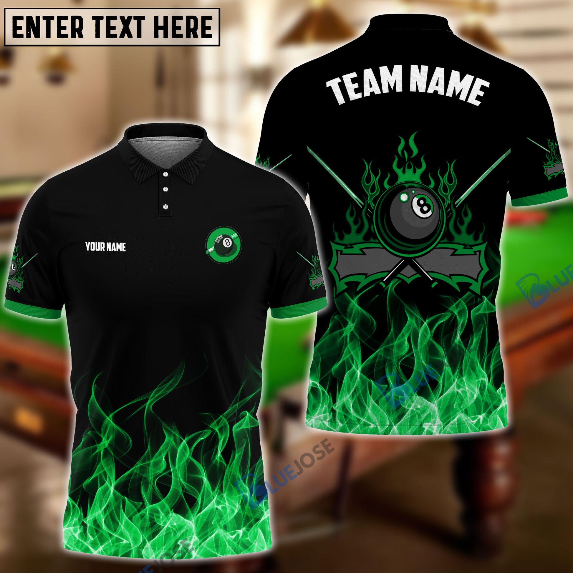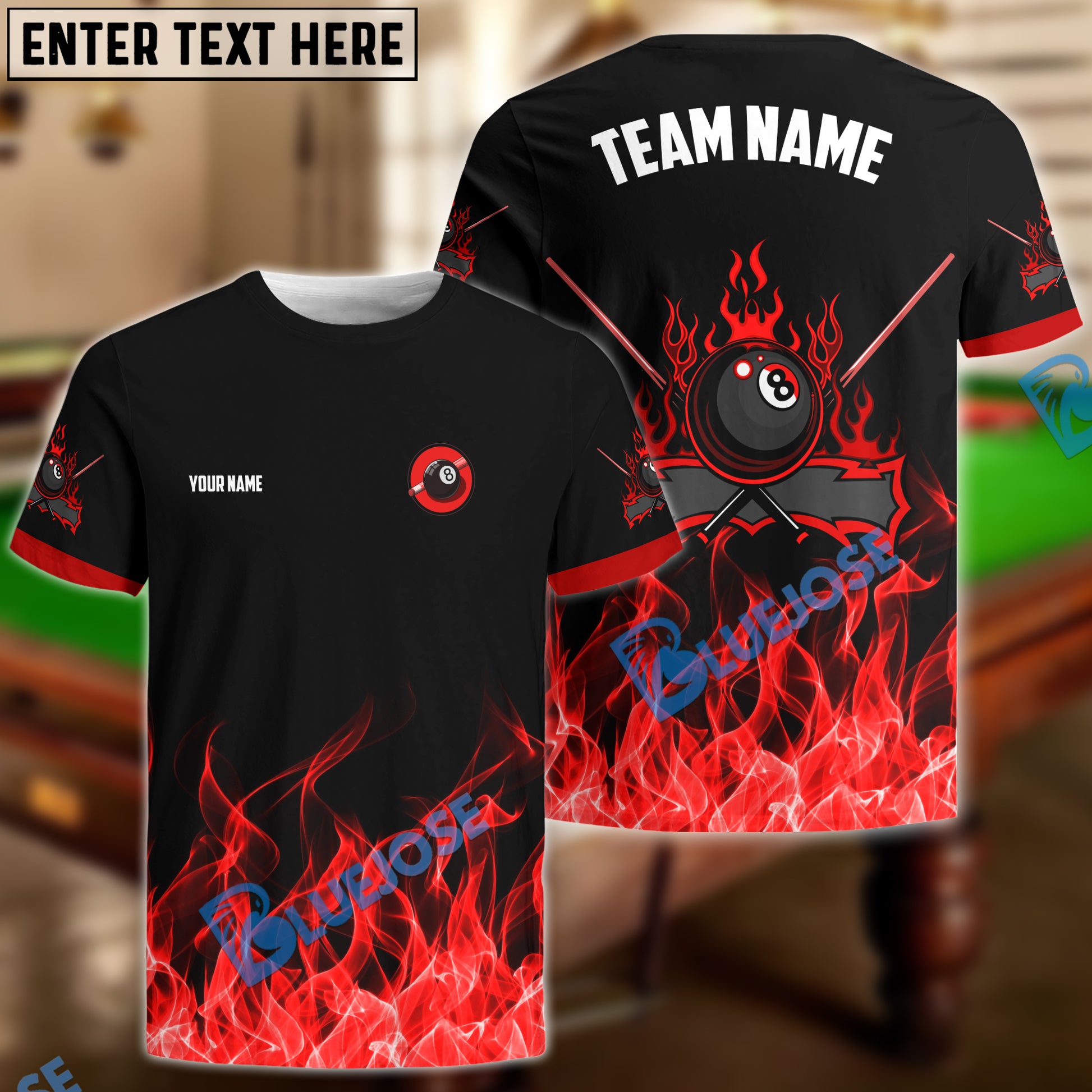 BlueJose Personalized Billiards 8-Ball Fire Pattern Shirt (Blue, Green, Yellow & Red)
