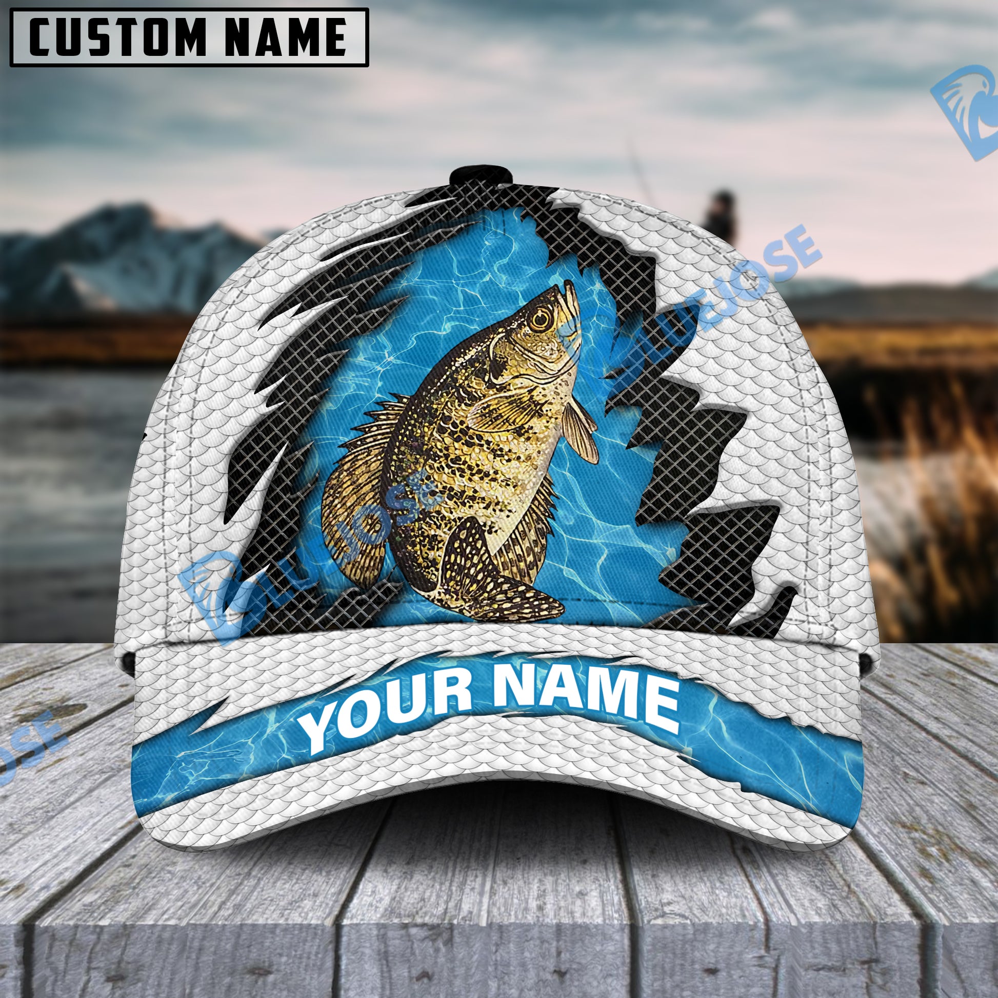 BlueJose Personalized Crappie Fishing White Blue Wave Fishnet Classic Cap