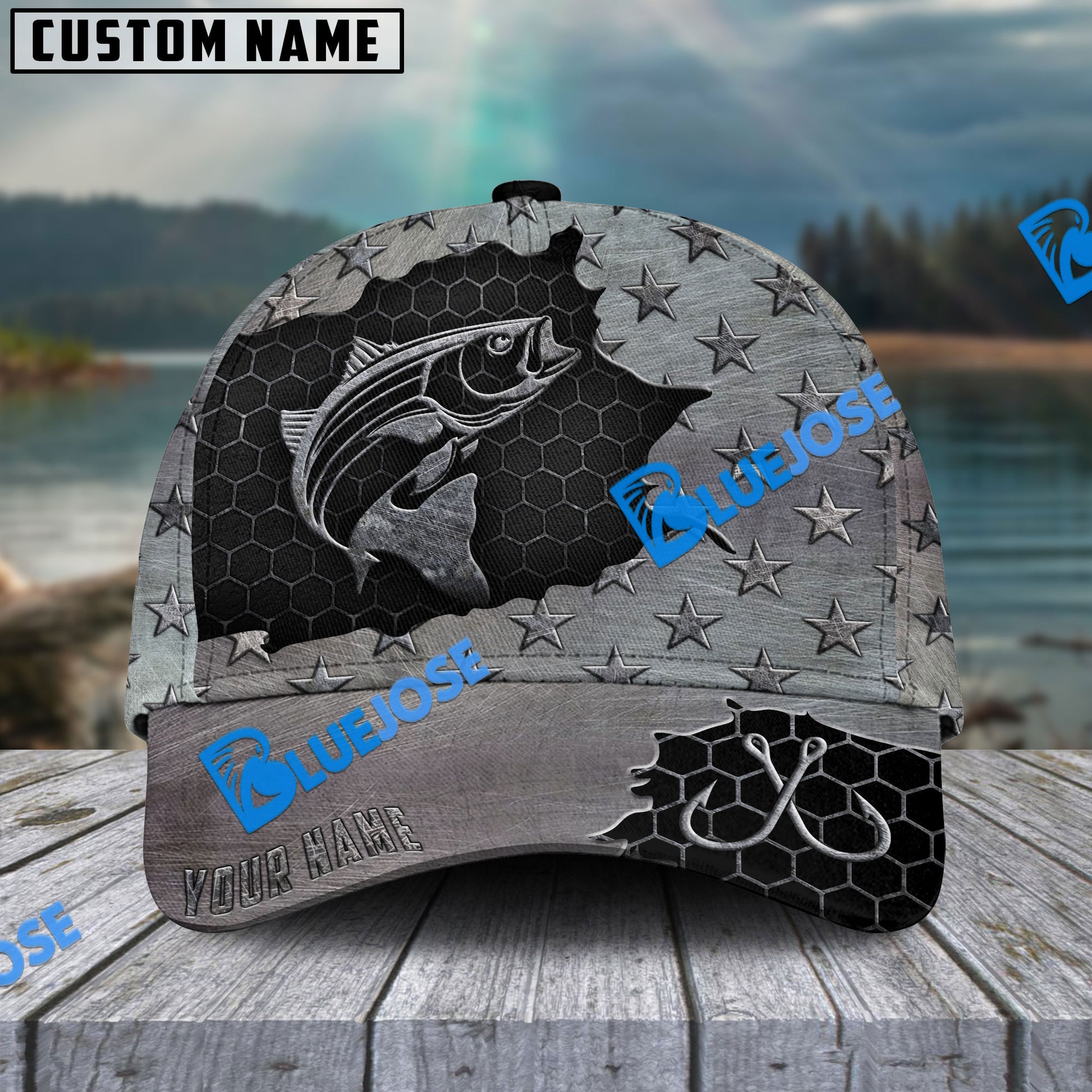 BlueJose Personalized Striped Bass Fishing Black Metal Pattern Classic Cap