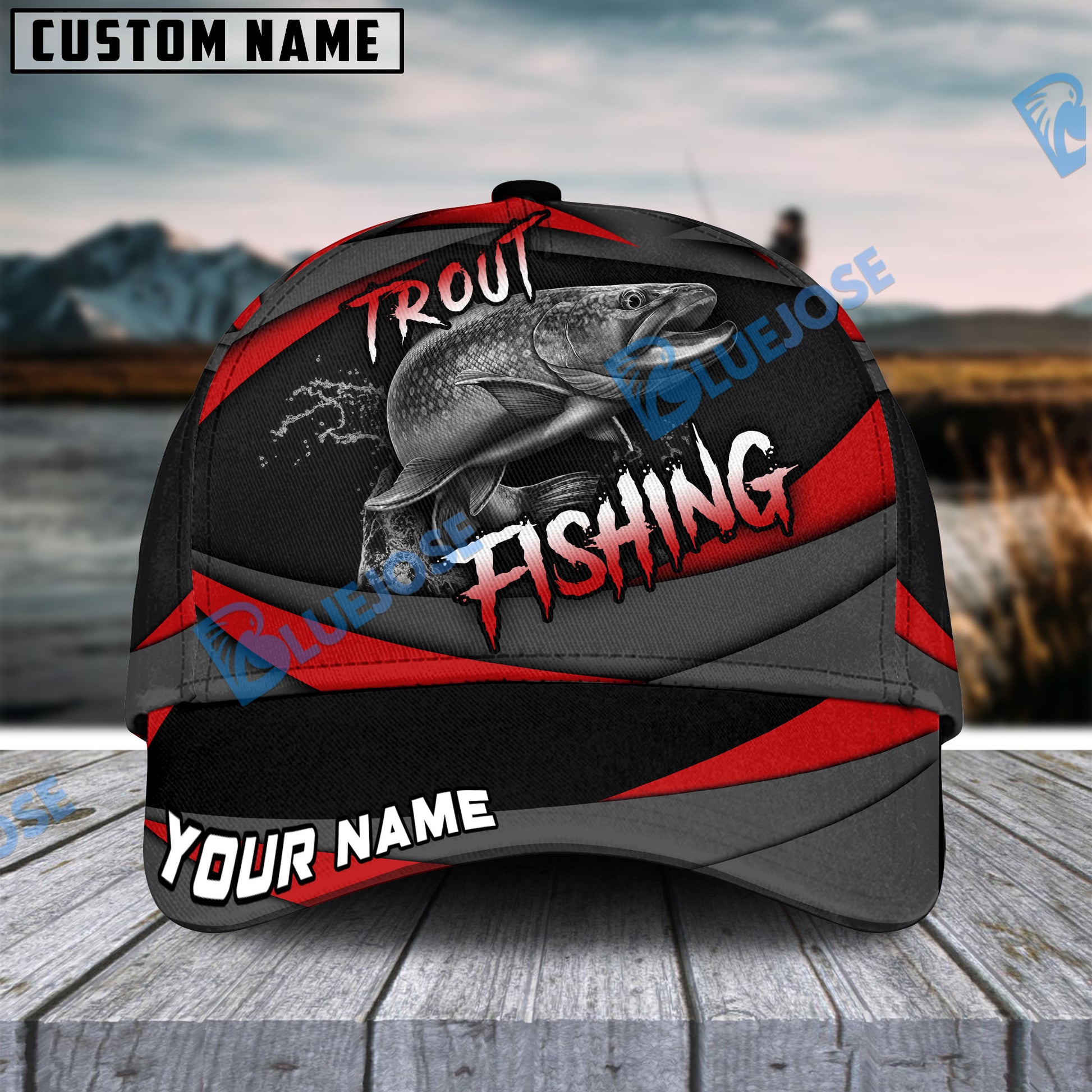 BlueJose Personalized Trout Fishing Red Gray Spinning Pattern Classic Cap