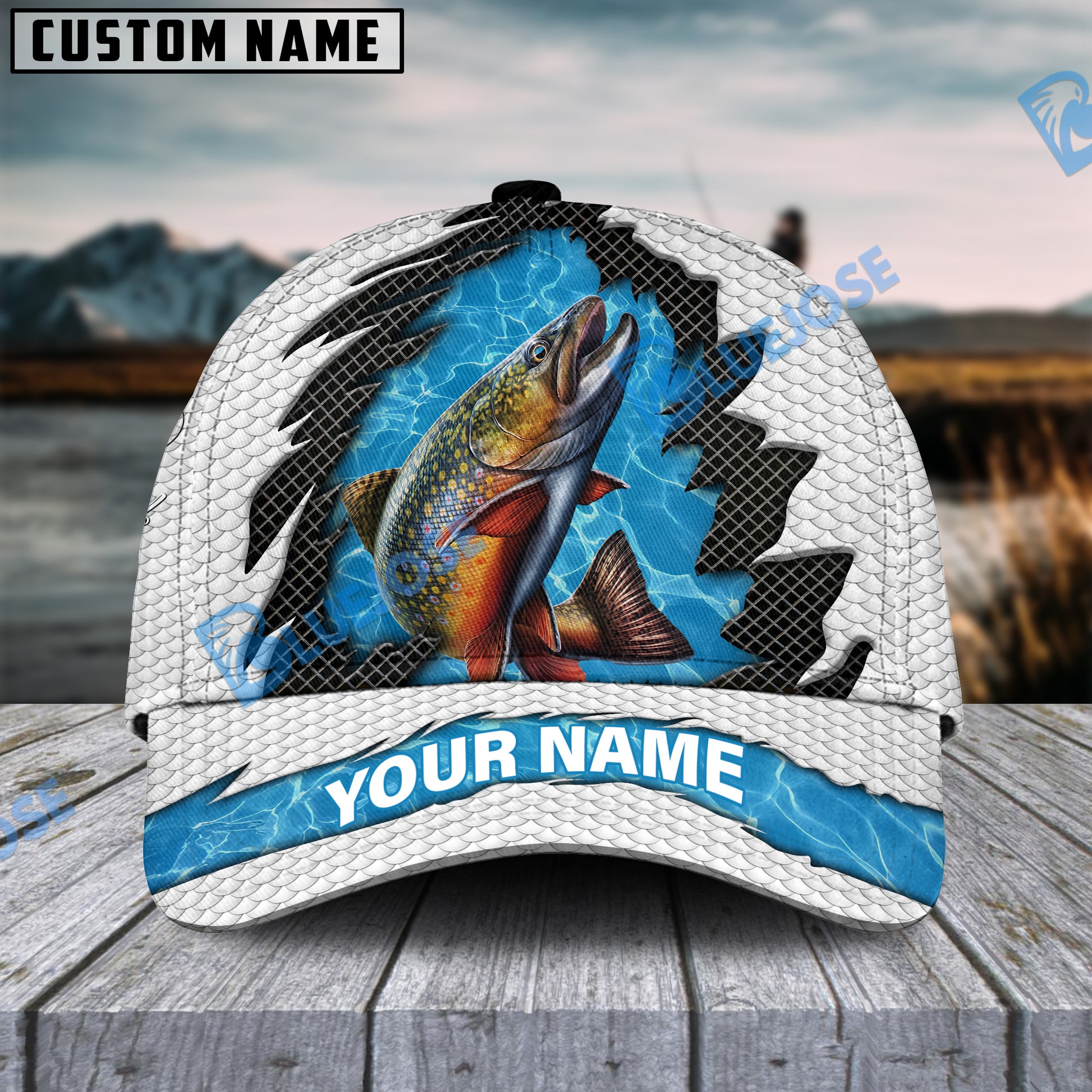 BlueJose Personalized Trout Fishing White Blue Wave Fishnet Classic Cap