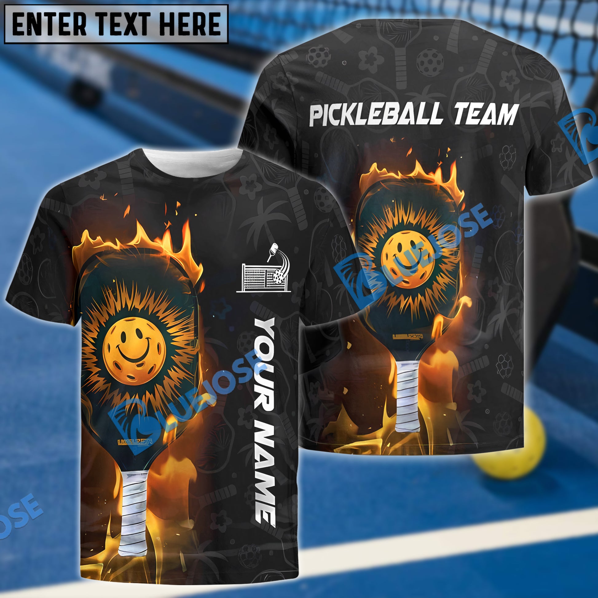 BlueJose Pickleball Flaming Paddle Smiley Face Custom Name & Team 3D Shirt (4 Colors)