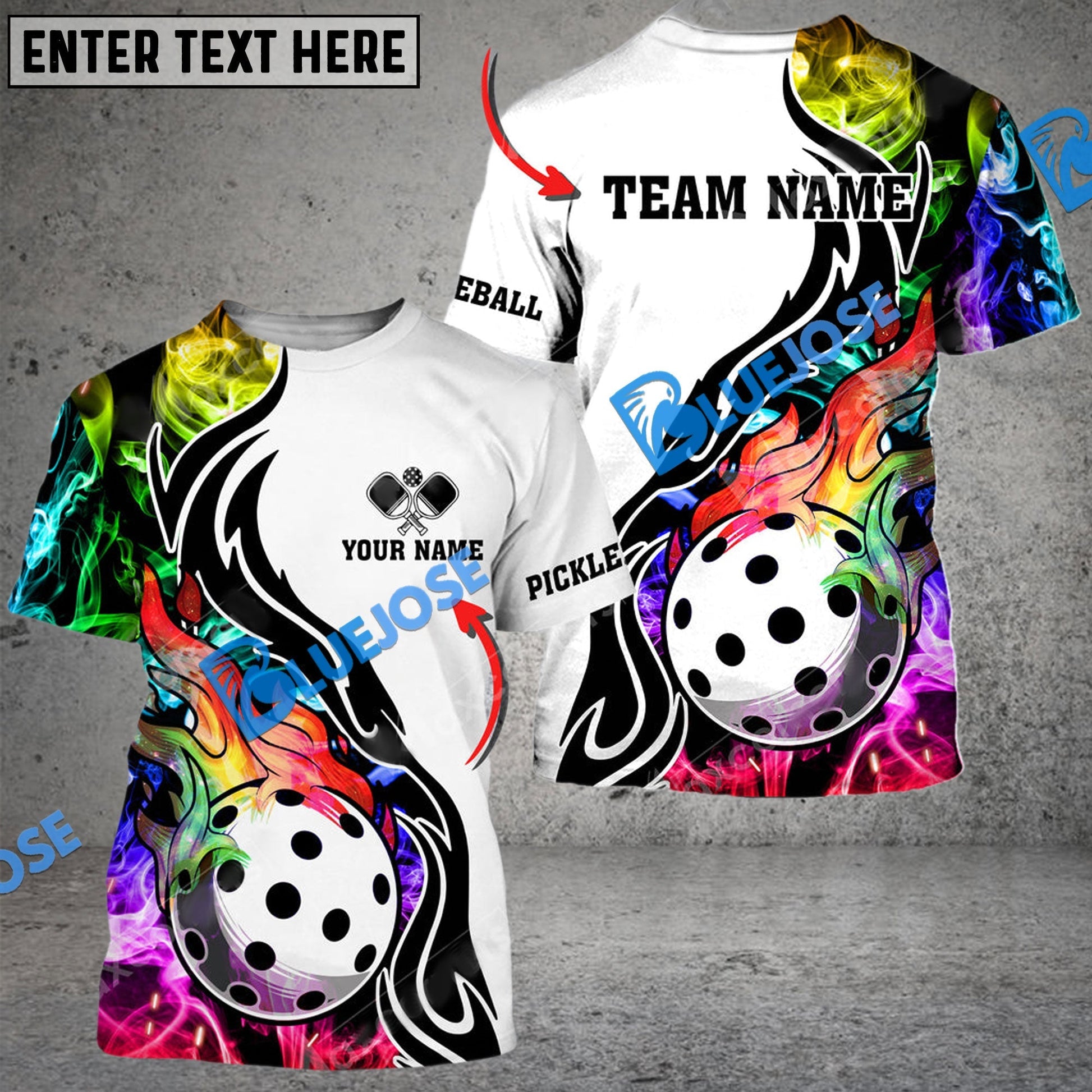 BlueJose Pickleball Rainbow Smoke 3 Personalized Name, Team Name Unisex Shirt
