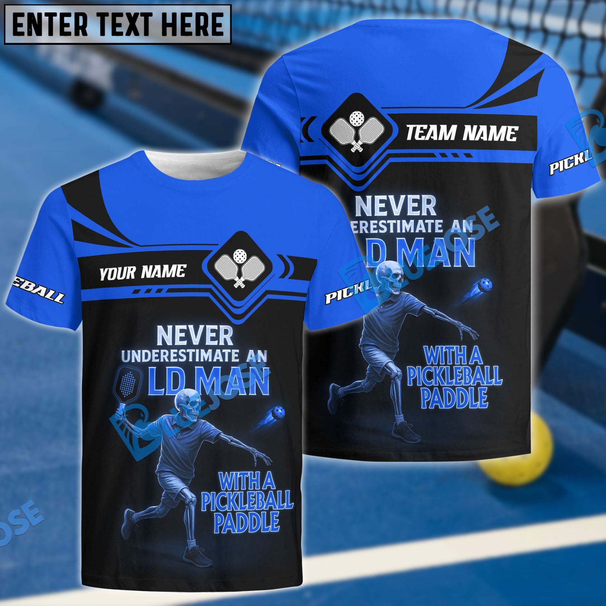 BlueJose Pickleball Never Underestimate Old Man With Paddle Skeleton Customized Name 3D Shirt (4 Colors)