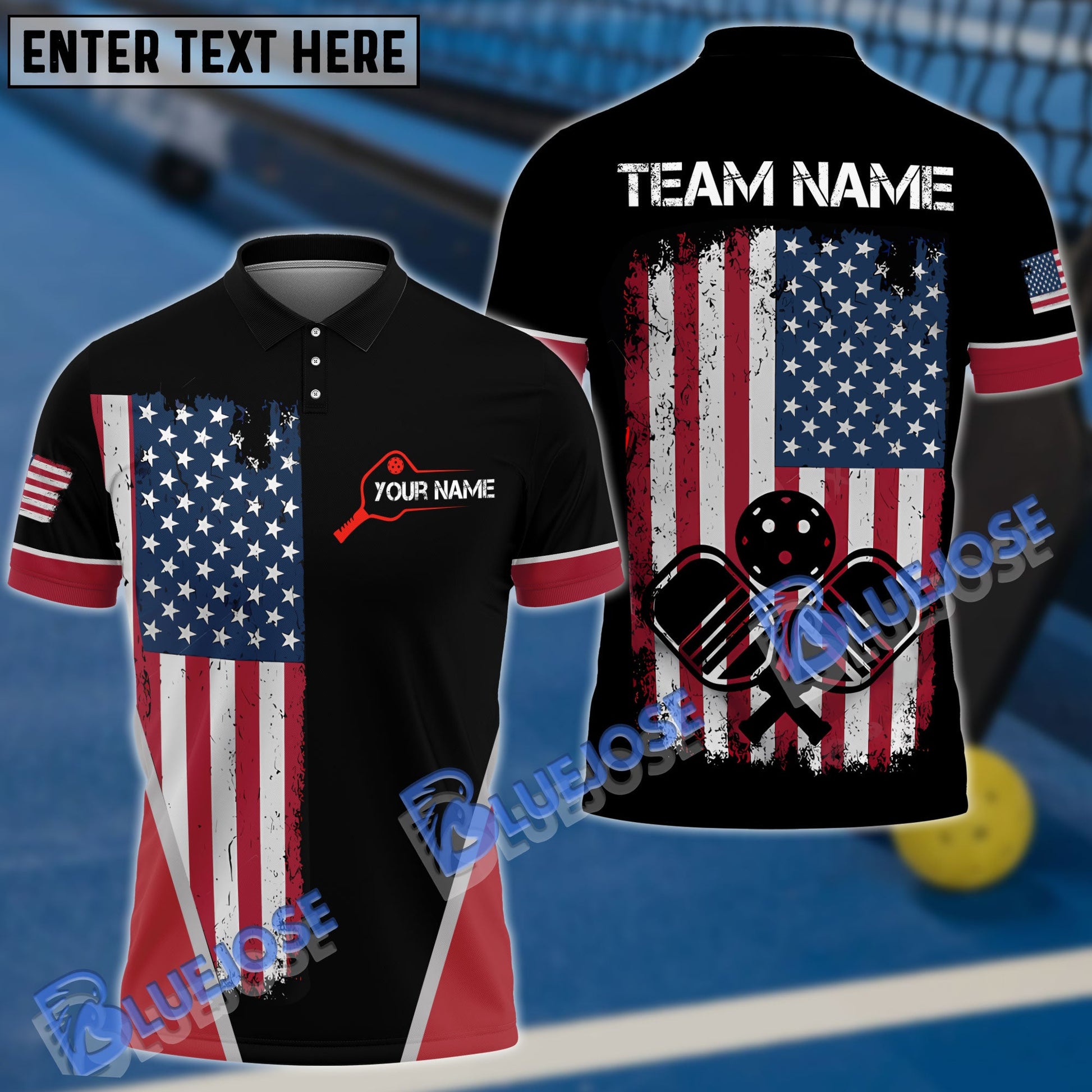 BlueJose Pickleball US Flag Personalized Name, Team Name Unisex Shirt