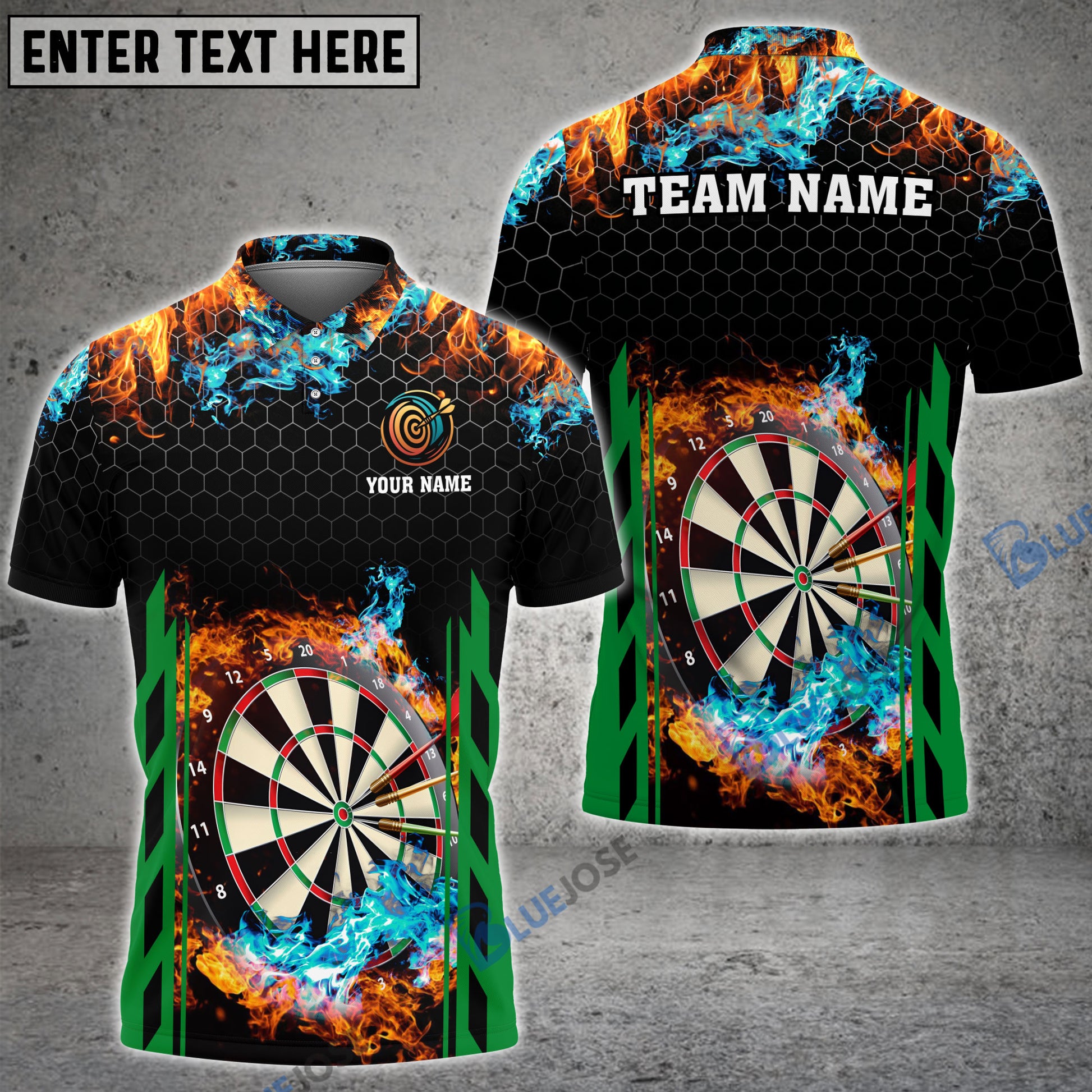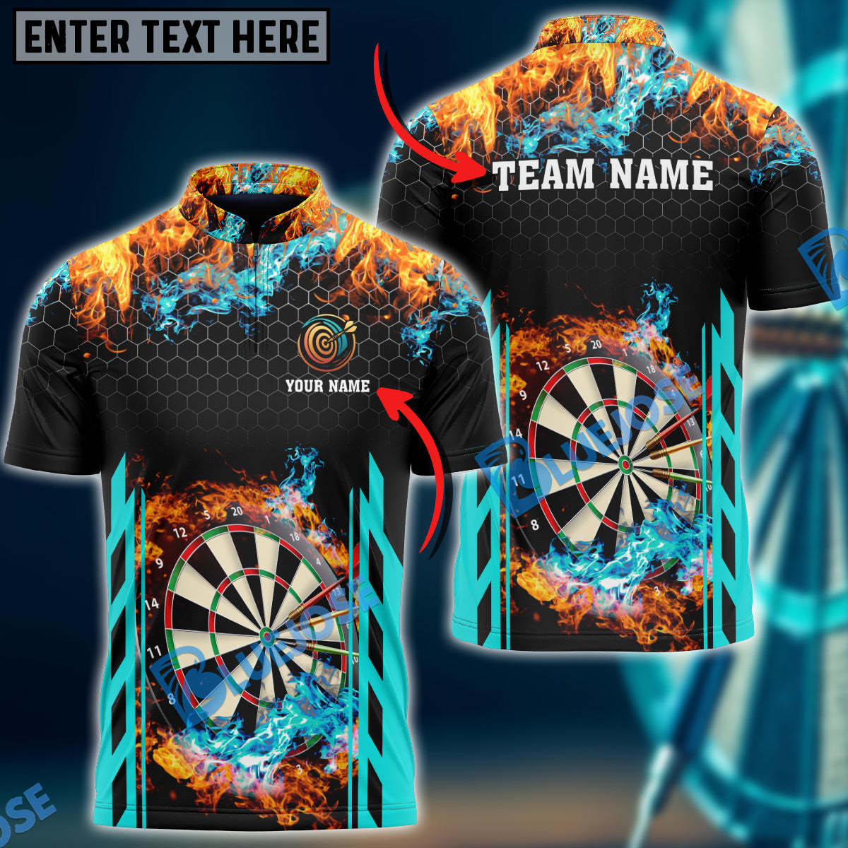BlueJose Red and Blur Fire Dart Board Personalized Name, Team Name 3D Shirt (6 Colors)