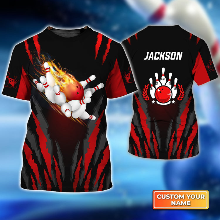 BlueJoses Bowling Ball in Flames Breaks White Skittles Personalized Name 3D Shirt