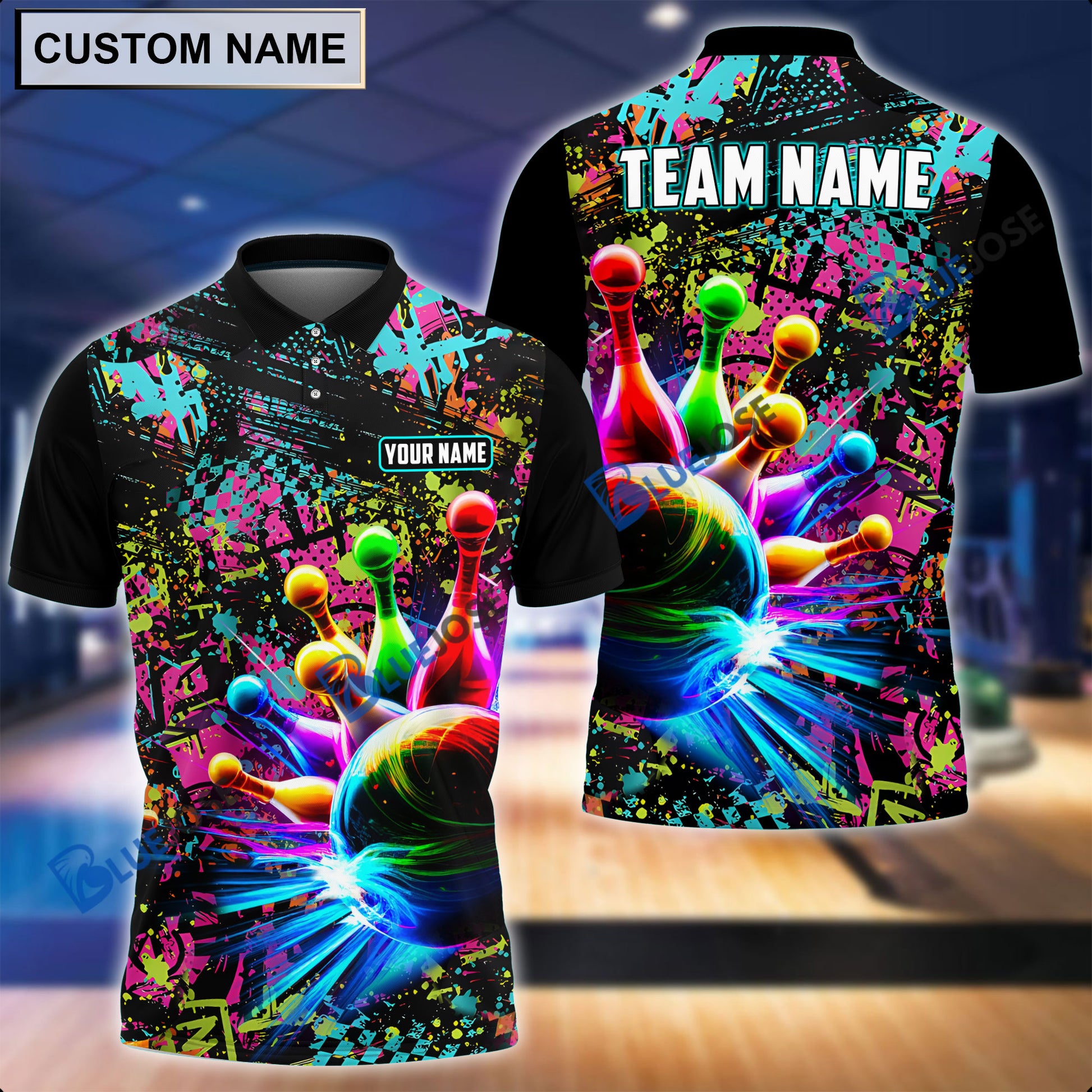 BlueJoses Personalized Name and Team Name Paint Colorful Bowling and Pins 3D Shirt