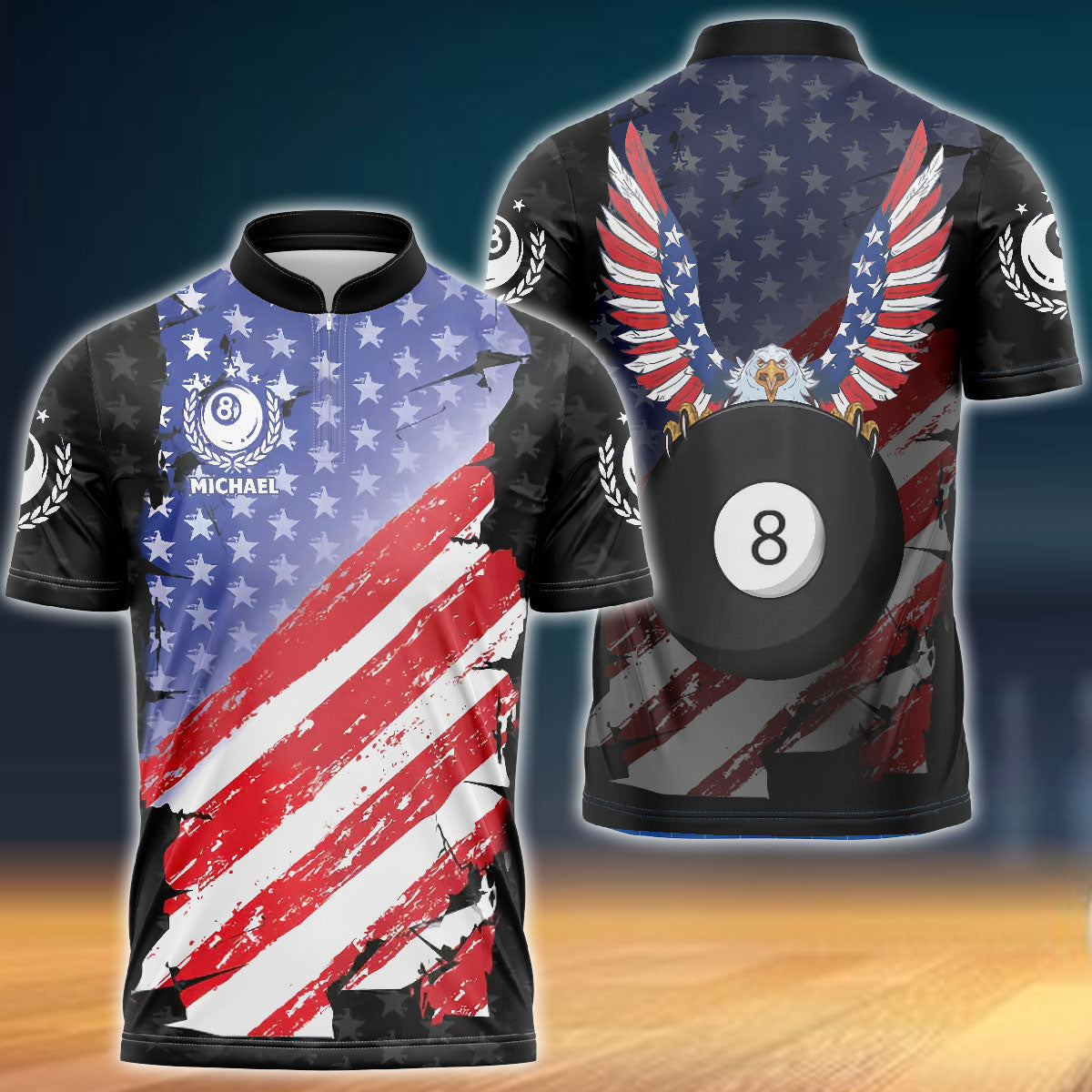 BlueJose Ball 8 Eagle USA Flag Billiard Custom Name Zipper Polo Shirt