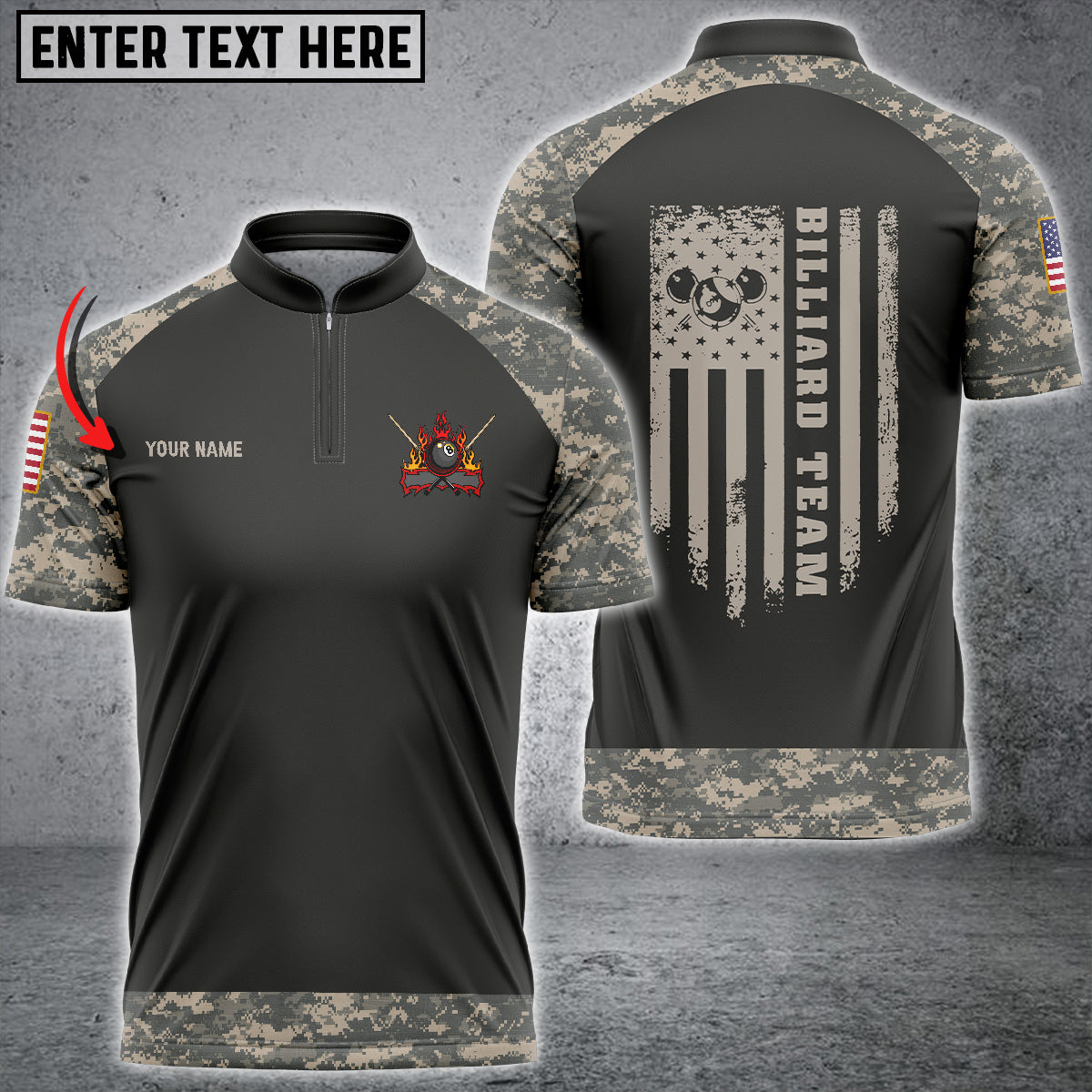 BlueJose Retro Camouflage Flag Billiard Custom Name Zipper Polo Shirt