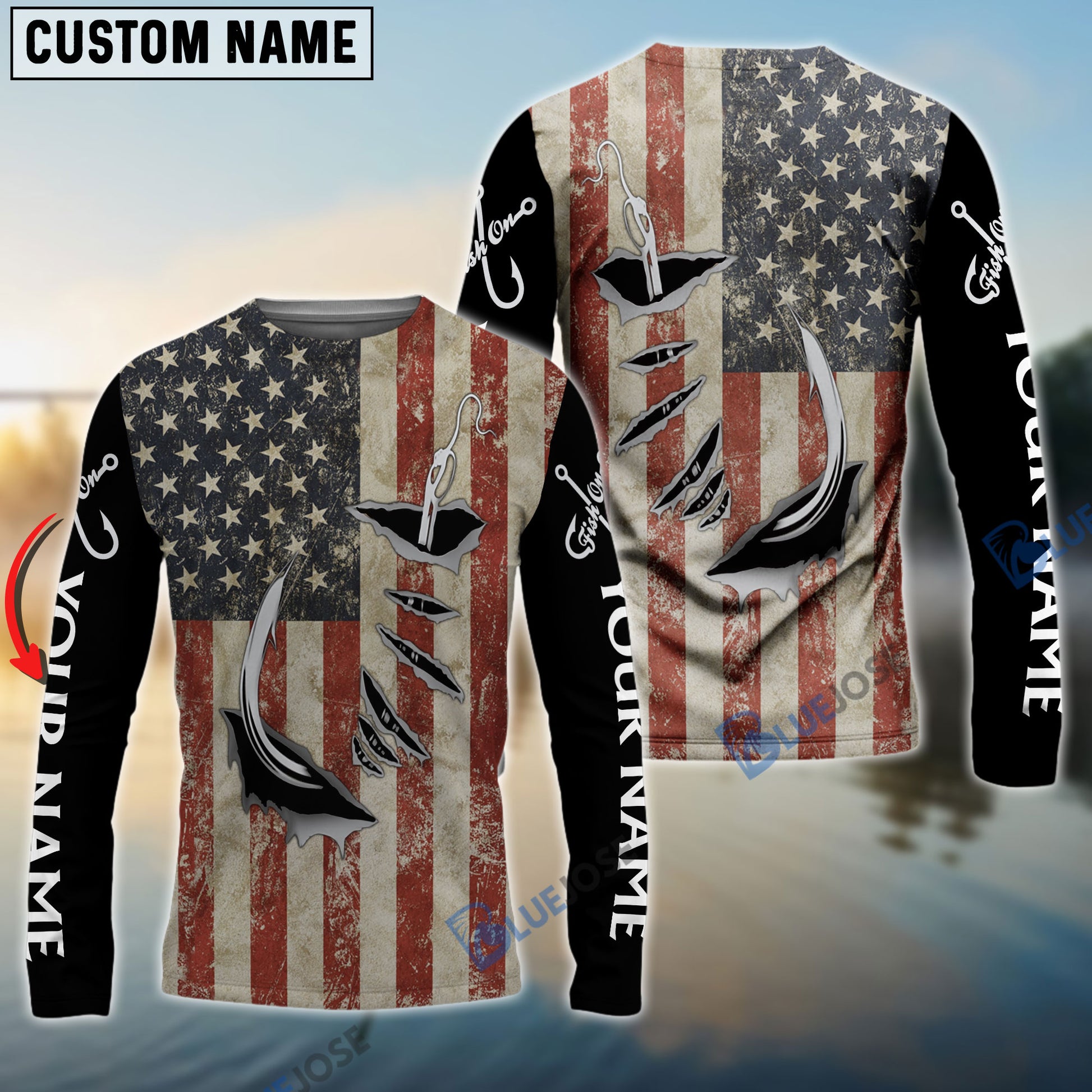 Bluejose Us Fishing 3D Fish Hook American Flag Patriotic Fish On Quick Dry Customize Name Long Sleeves Shirts