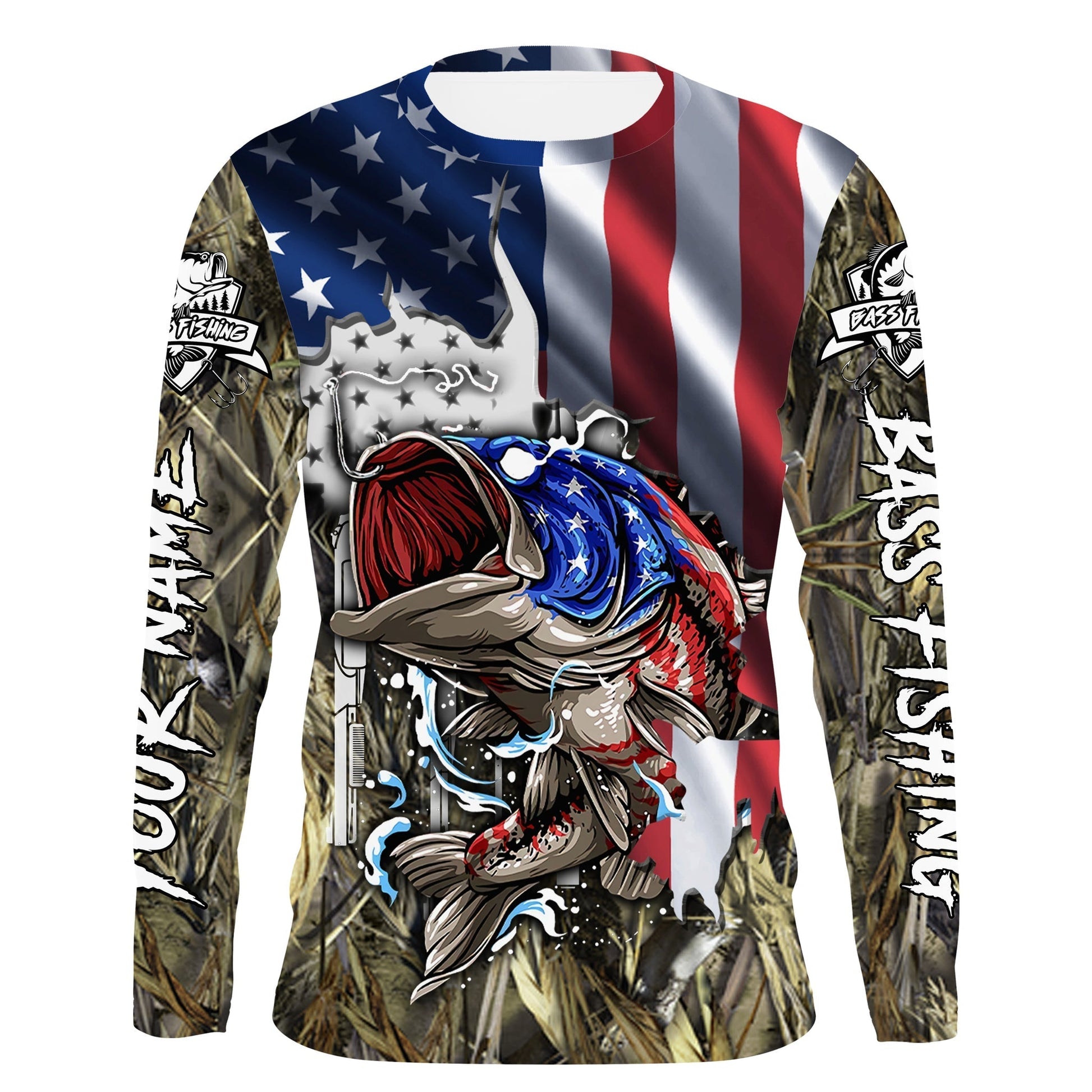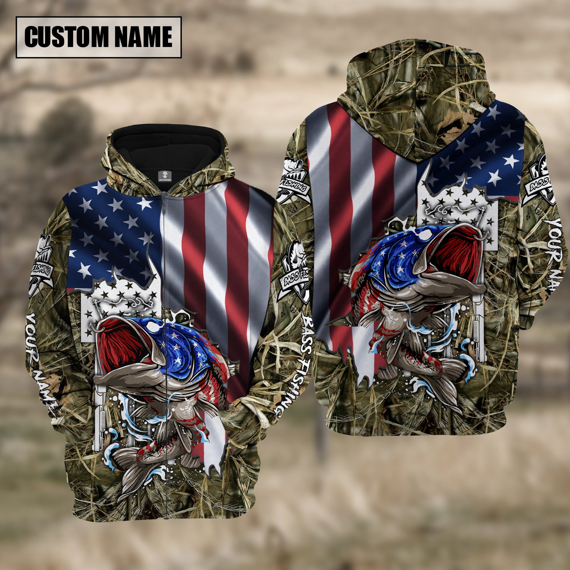 Bluejose American Flag Patriotic Largemouth Bass Camo Fishing Custom Name 3D Hoodie