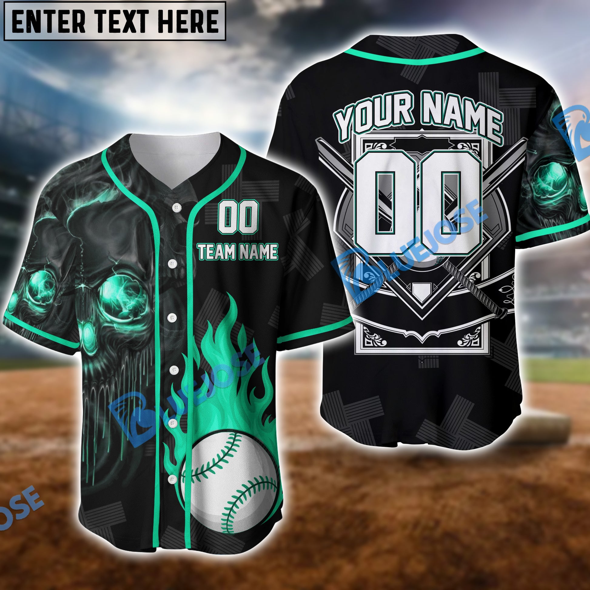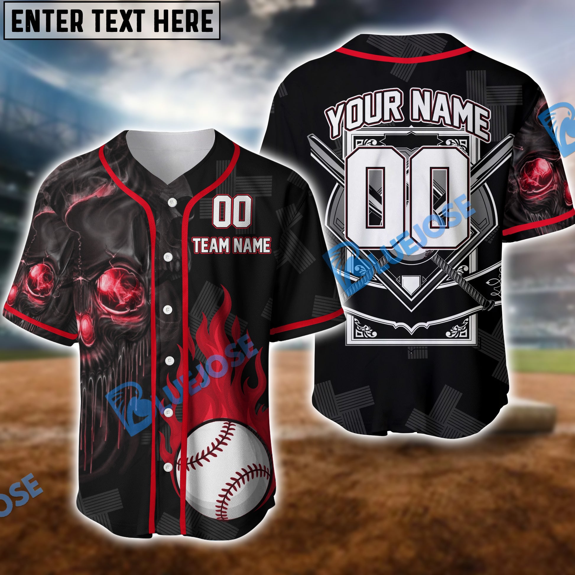 BlueJose 3D Skull Flame Baseball Jersey, Personalized Team Name & Number (4 Color Options)