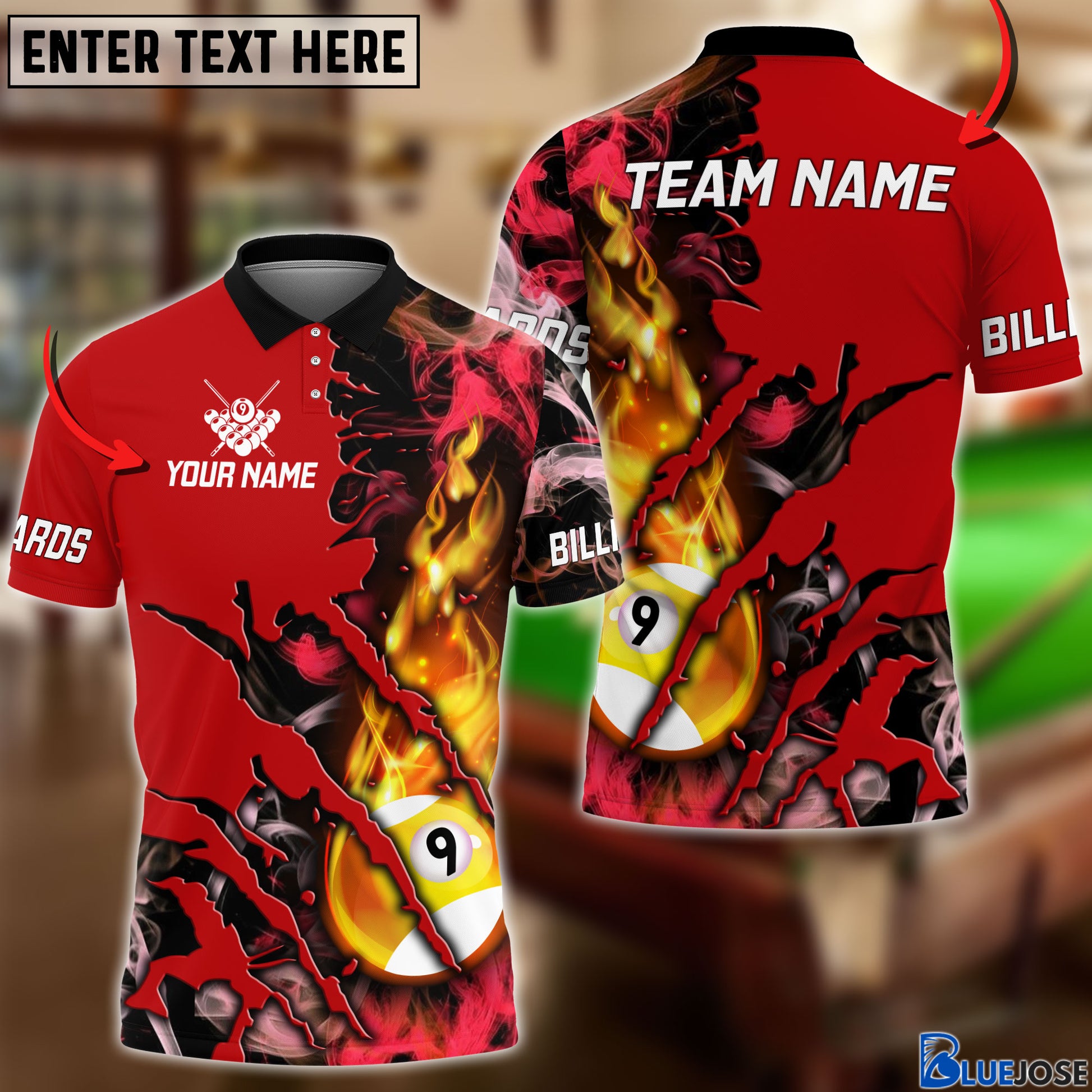 BlueJose Billiards Flame Smoke Pattern Personalized Name, Team Name Unisex Shirt