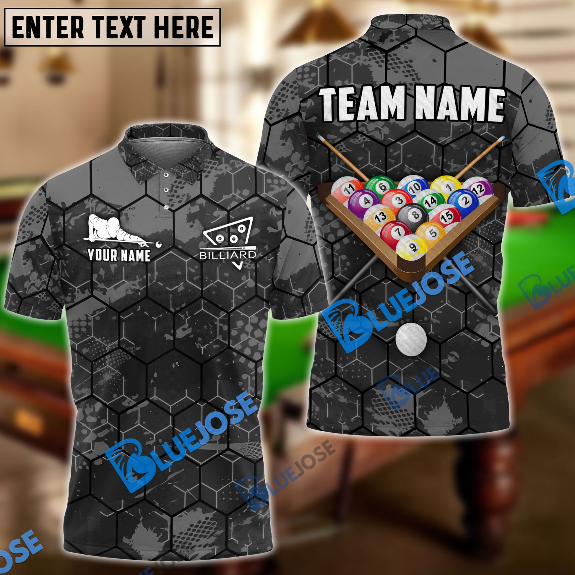 BlueJose Billiards Ball 8 Grunge Hexagon Personalized Name, Team Name Unisex Shirt ( 6 Colors )