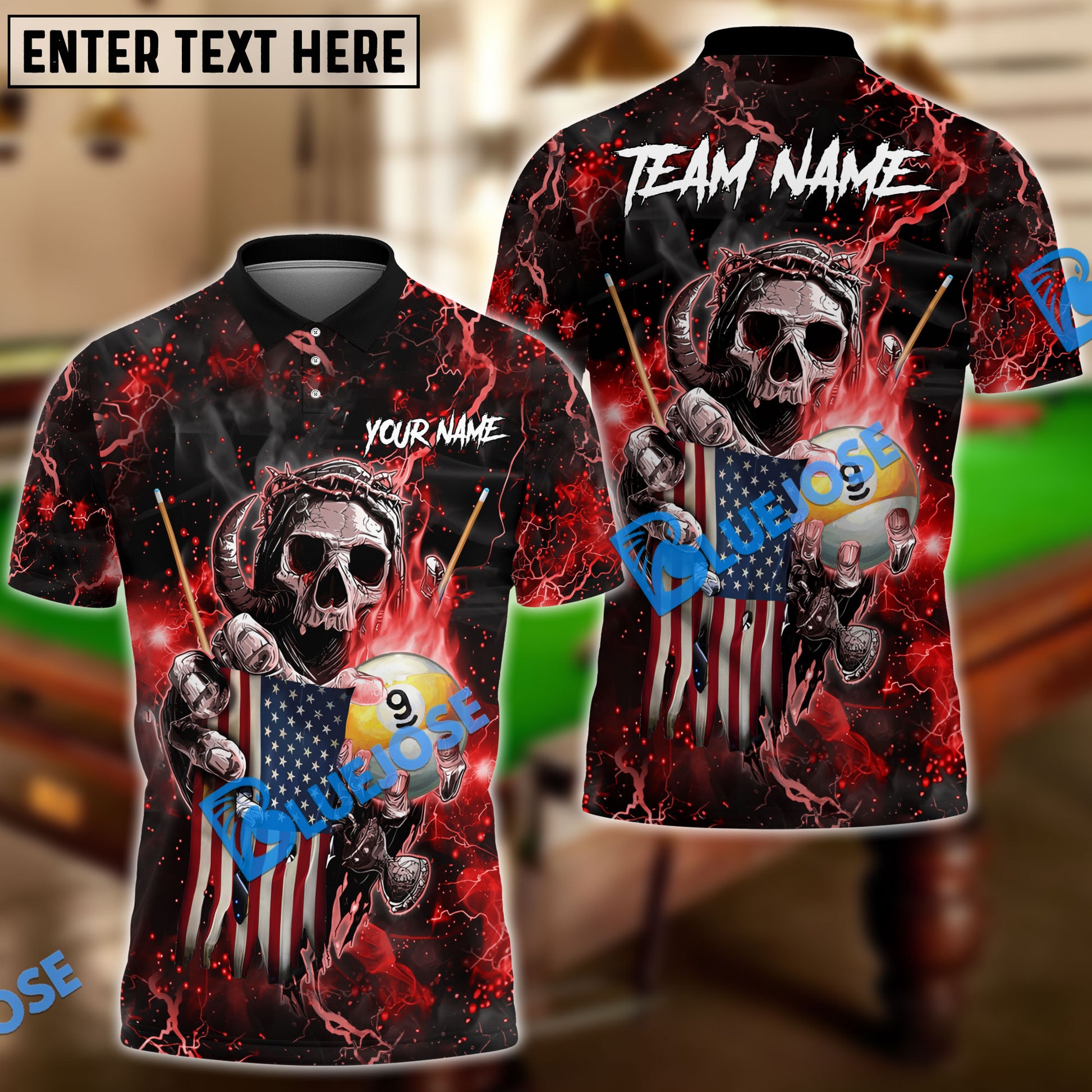BlueJose Billiards Ball 9 Fire Skull US Flag Personalized Name, Team Name Unisex Shirt ( 6 Colors )