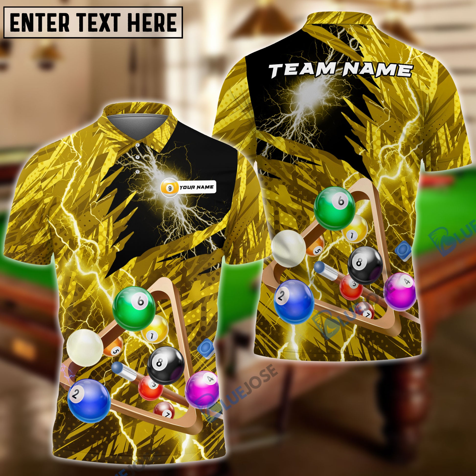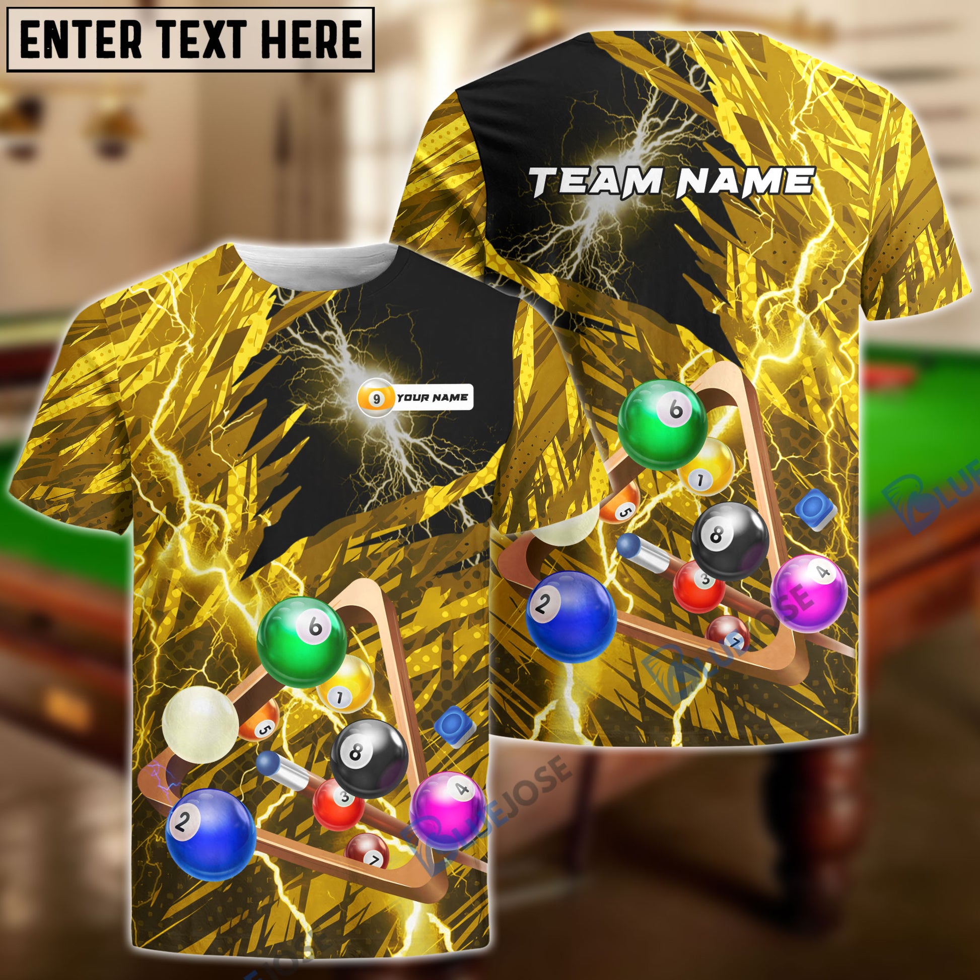 BlueJose Billiards Yellow Lightning Personalized Name, Team Name Unisex Shirt