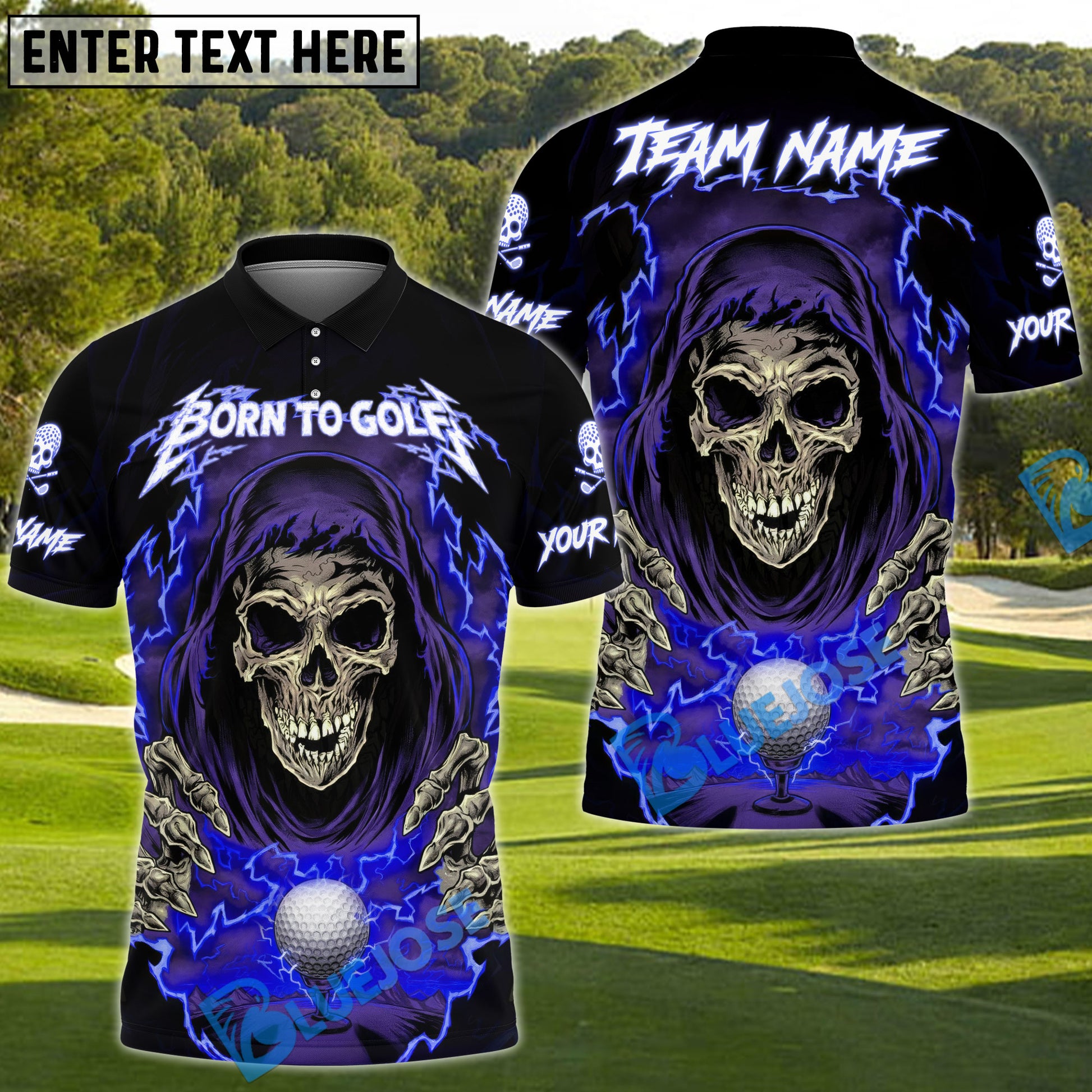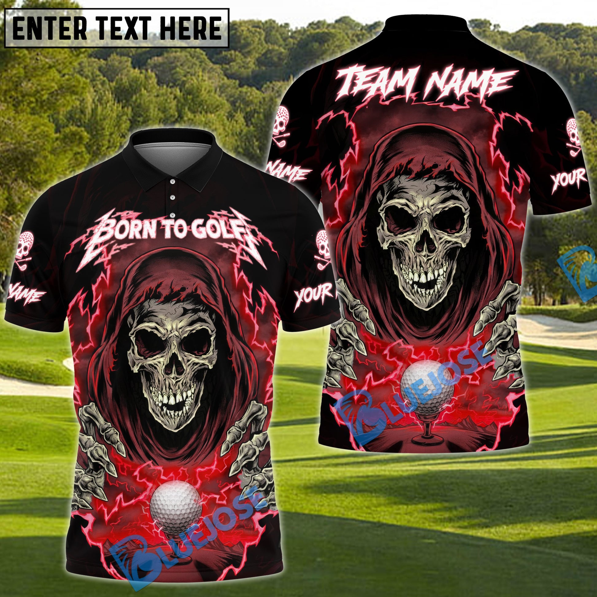 BlueJose Born to Golf Reaper Polo Shirt, Customized Name & Team Name 3D Shirts (4 Colors)