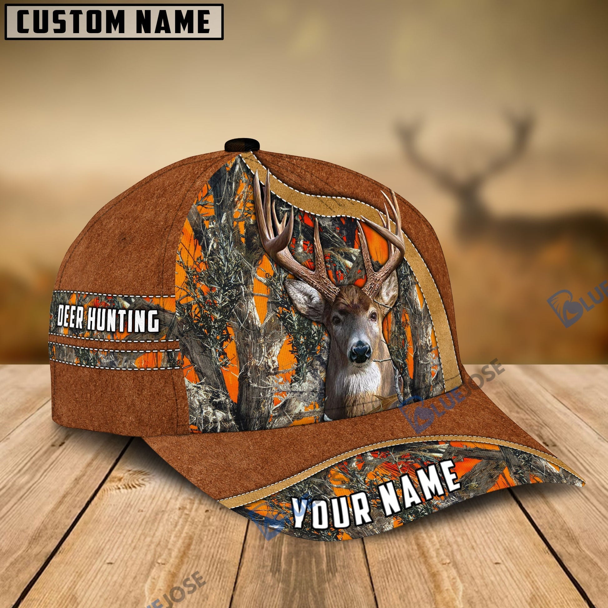 BlueJose Deer Hunting Light Brown Leather Pattern Personalized Name Cap